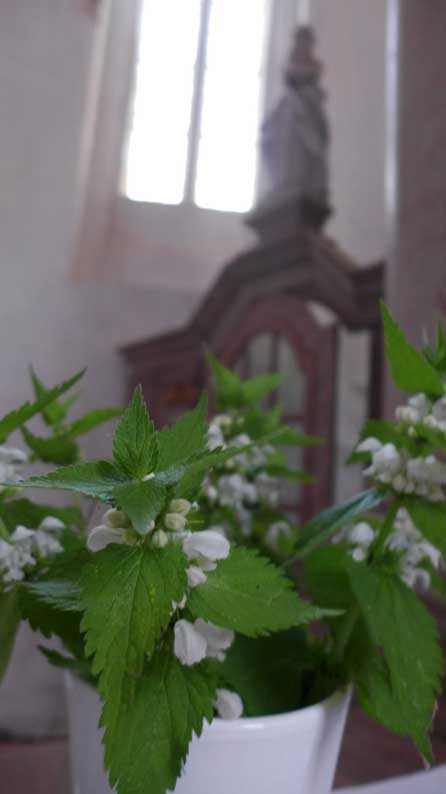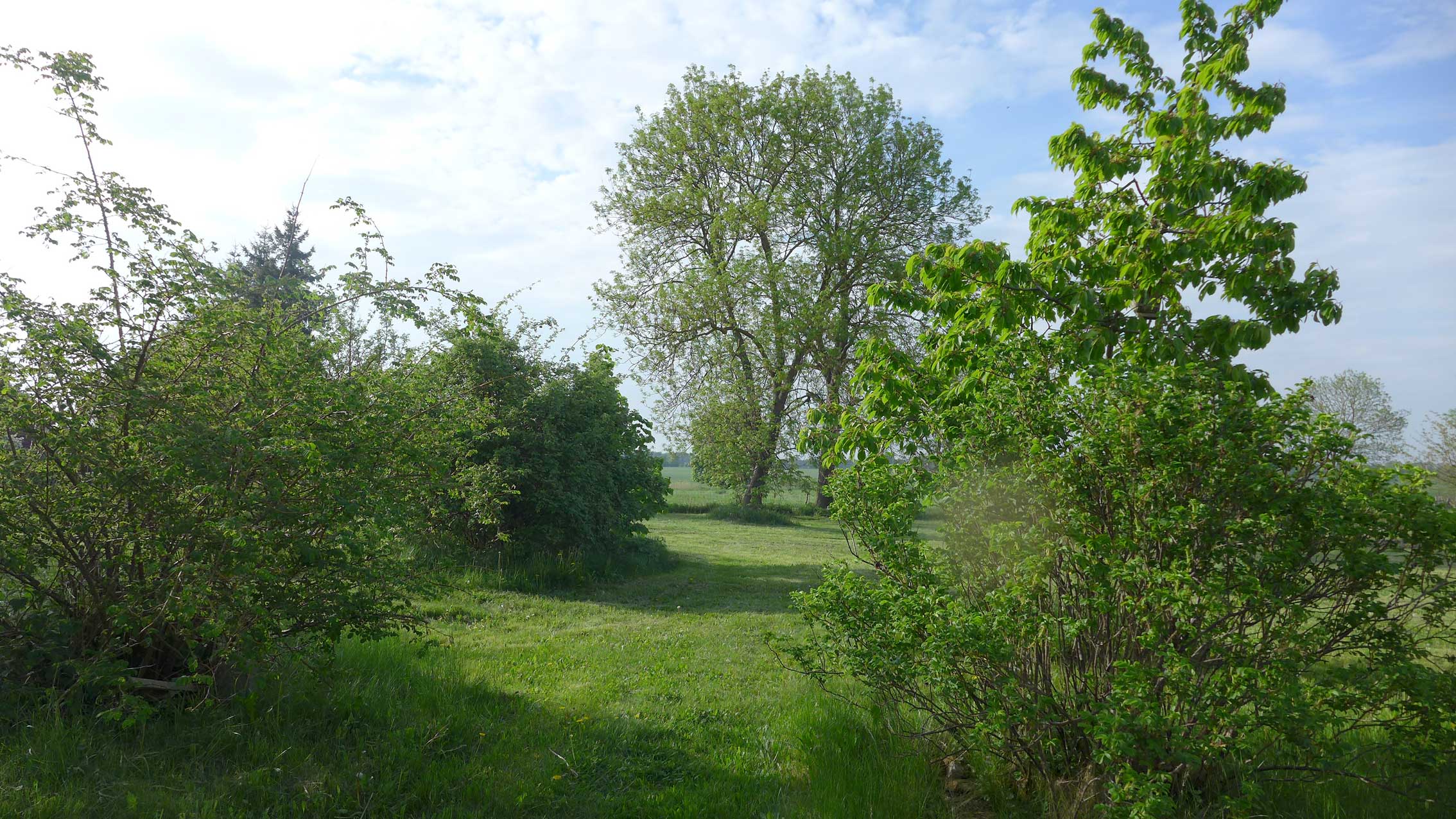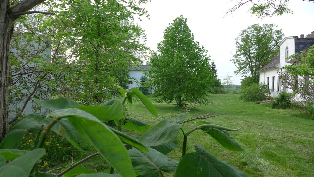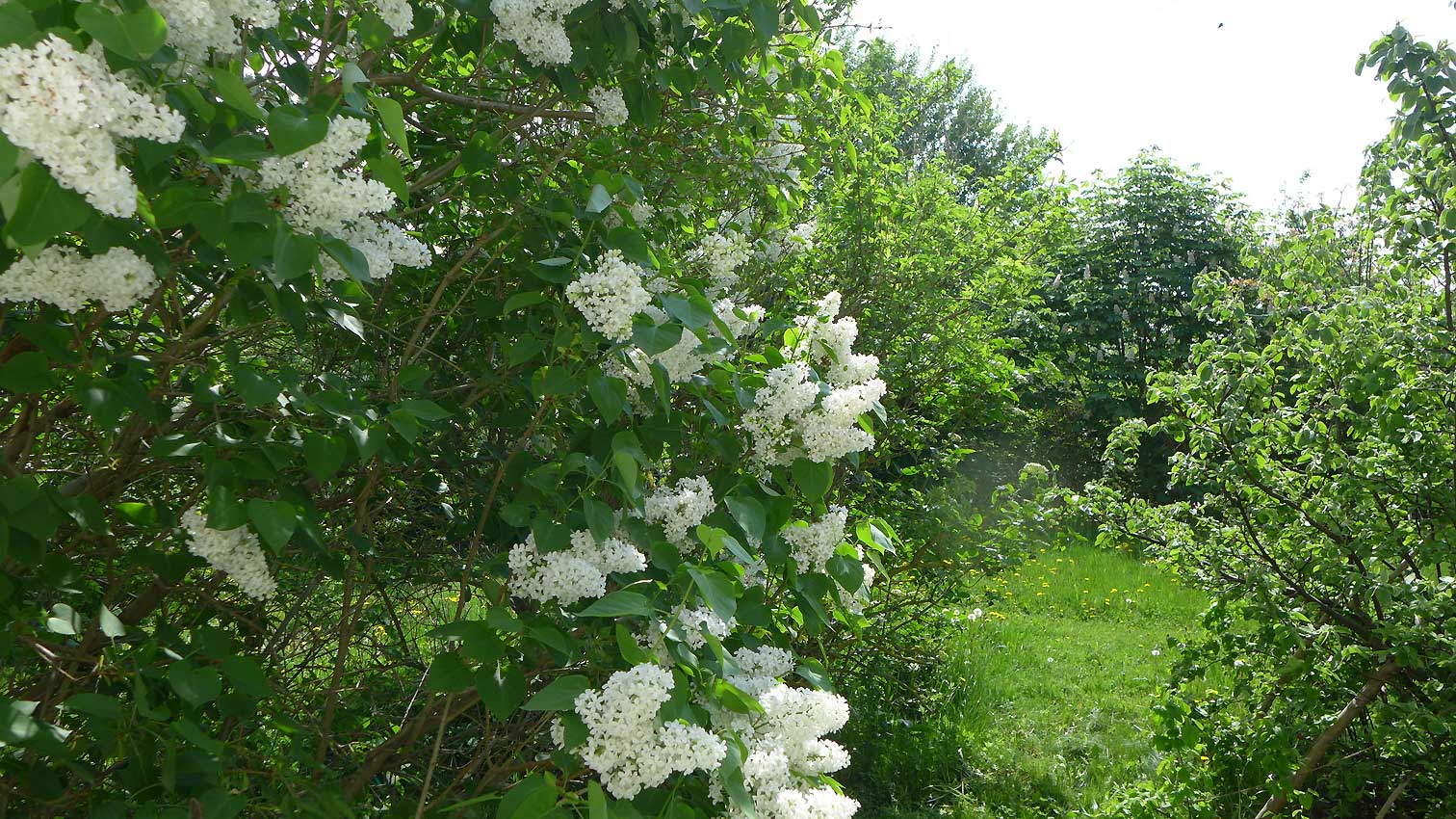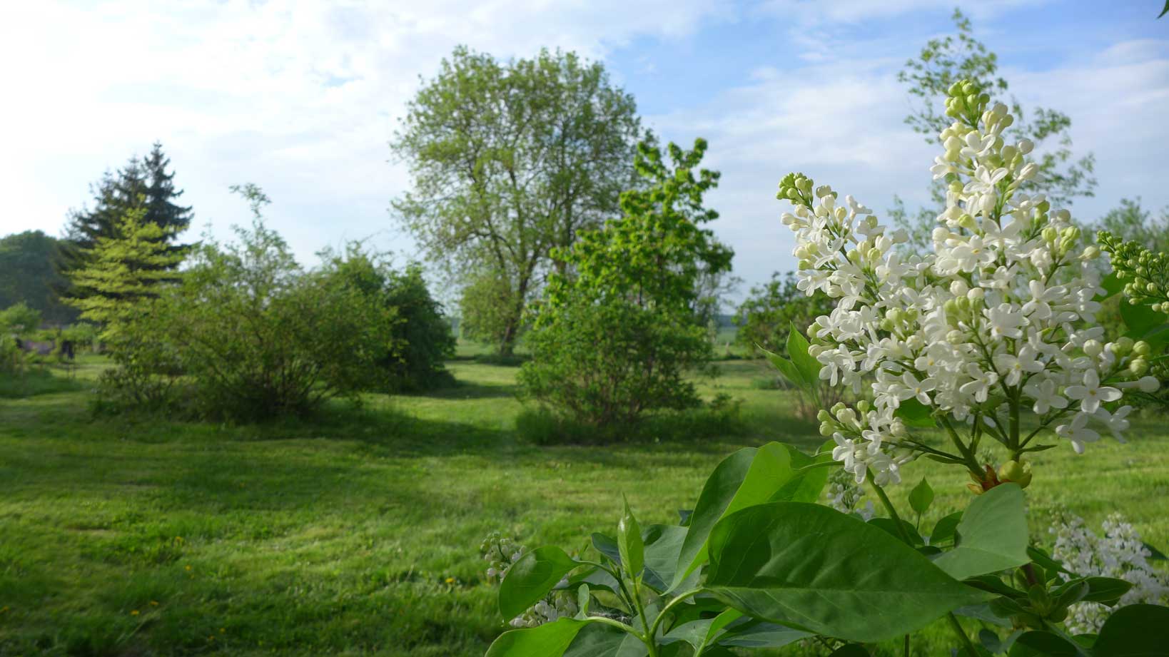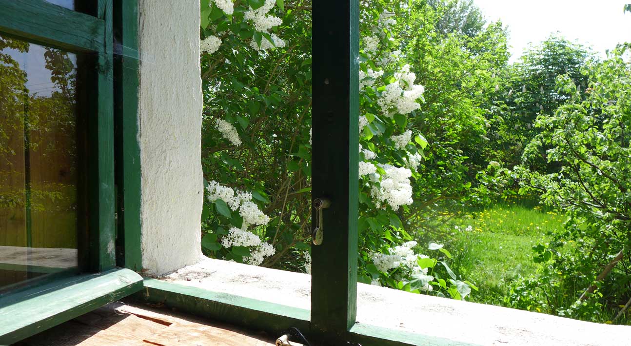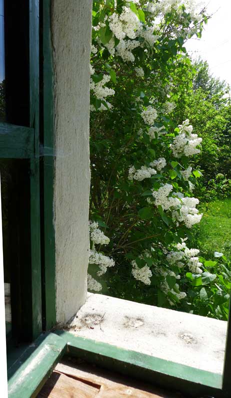 der Flieder vor dem Küchenfenster schaut auf das Land nun so
