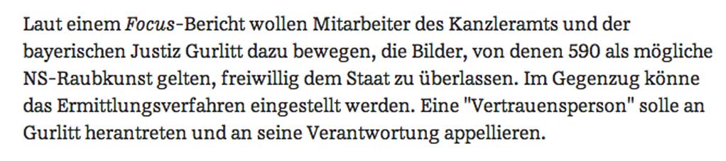 Man wolle Gurlitt dazu bewegen, die Bilder freiwillig dem Staat zu überlassen. Eine „Vertrauensperson“ solle an Gurlitt herantreten. Tatsächlich ist mittlerweile ausgerechnet Gurlitt die einzige Person, die den Rechtsstaat davor retten kann, sein Gesicht zu verlieren.
