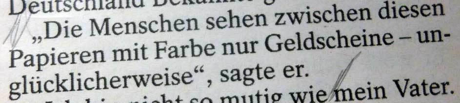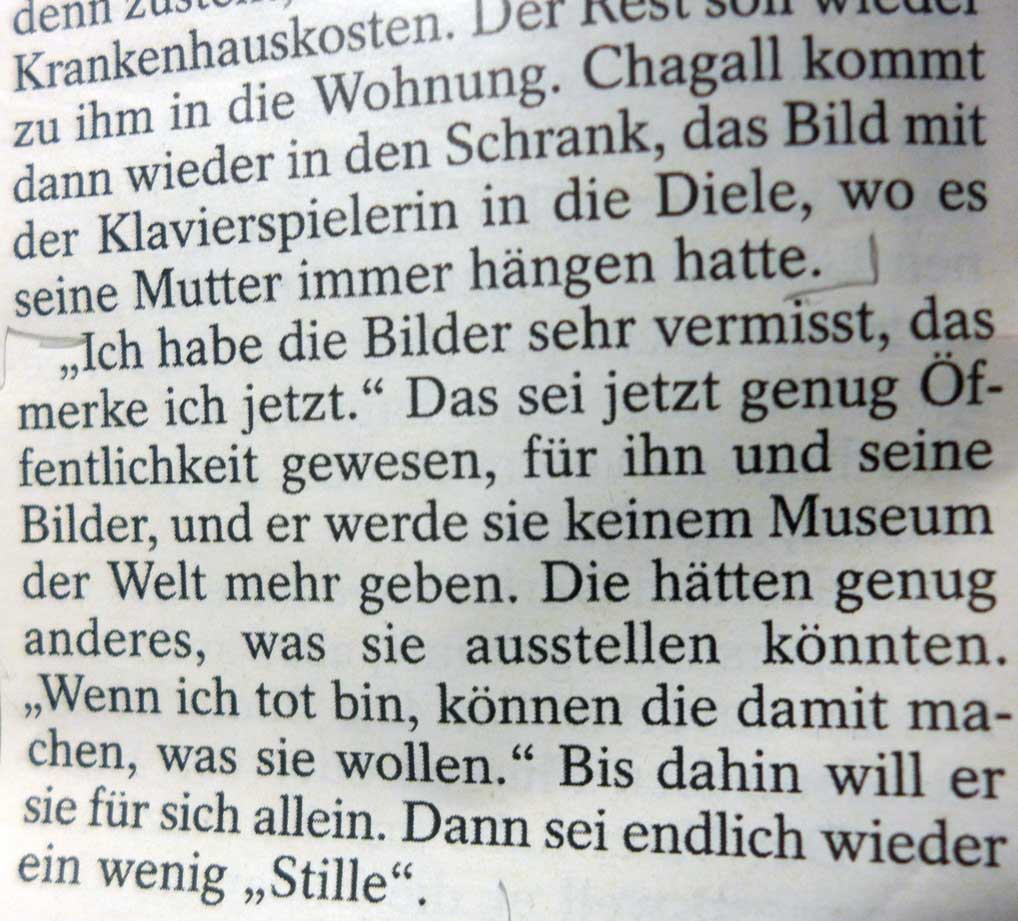 Der Kunst-Raub von Schwabing zeigt die ungestrafte Aktionen des Un-Rechts beispielhaft einfach in die Häuser einzubrechen und sich zu bedienen. Mit Tür aufbrechen und 30 Mann Truppe und mehreren Tage Abtransport vor den Augen des Wohnungbesitzers aus der Ecke stumm in Tränen und seines Eigentums Opfer der Zeit. Damit es alle Welt sähe was ihm lieb und teuer war, als seines Herzens Schatz. Allen offen und im Gelächter des Markts, was ihm sein Geheimnis war und Erbe grosser Rettung in der Not der Bomben und Fronten von innen und aussen.