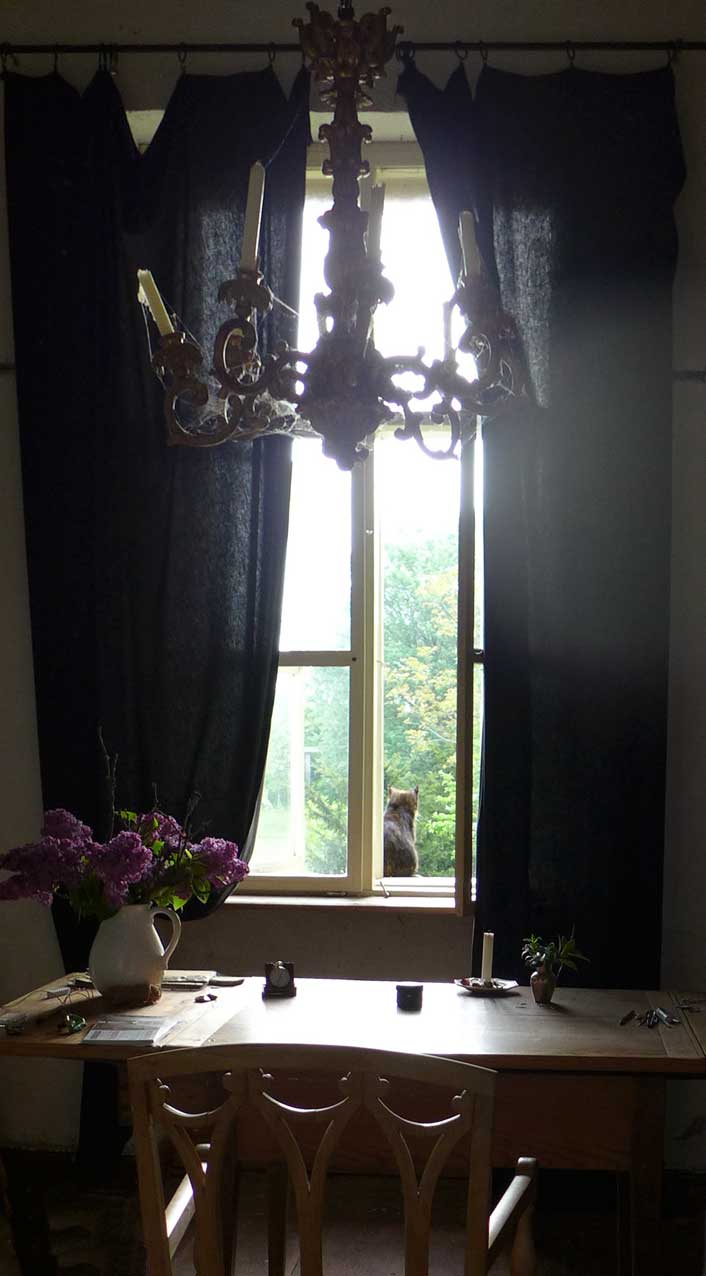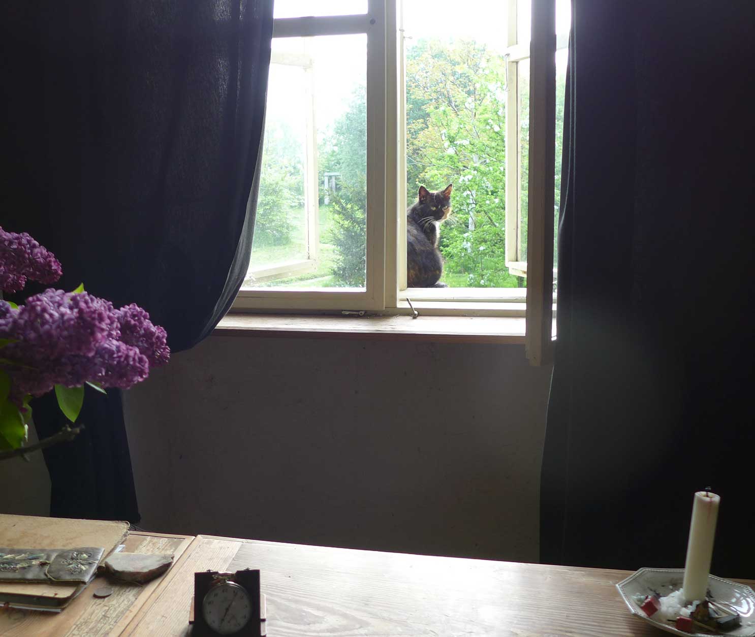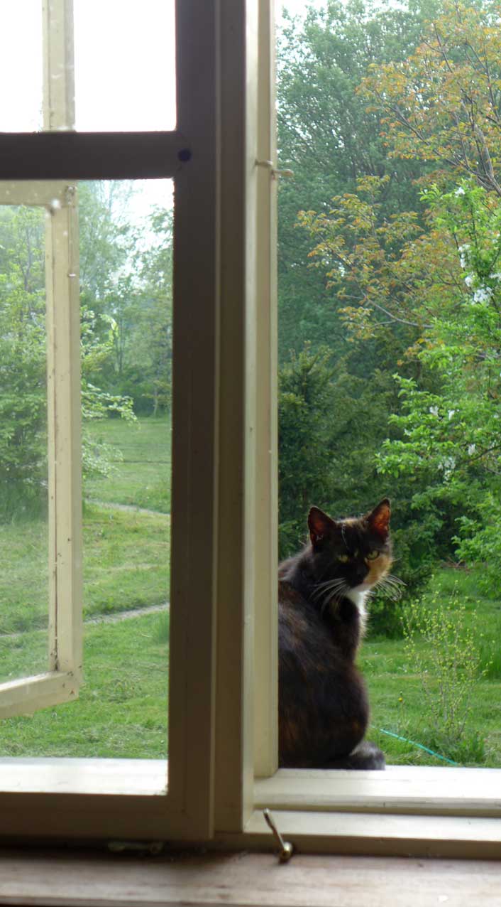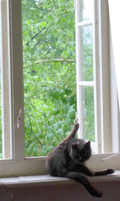 die andere Katze ohne eigenes Haus fand das offene Fenster und traut sich nun hinein als ob sie hier zuhause wäre nach soviel Scheu un Angst.