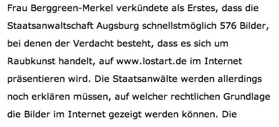 Beherzigen Sie die Verfügung Ihres Vaters, dass die Bilder als Lehen, also als geliehen, und nur zu Lebzeiten anvertraut zu verstehen sind und übergeben Sie die Sammlung an die Öffentlichkeit, d.h. dem deutschen Staat.
