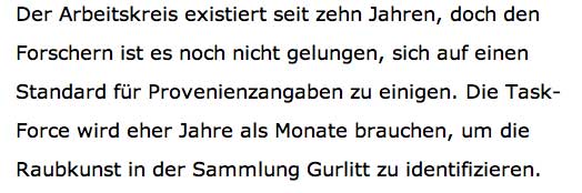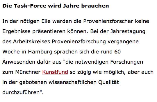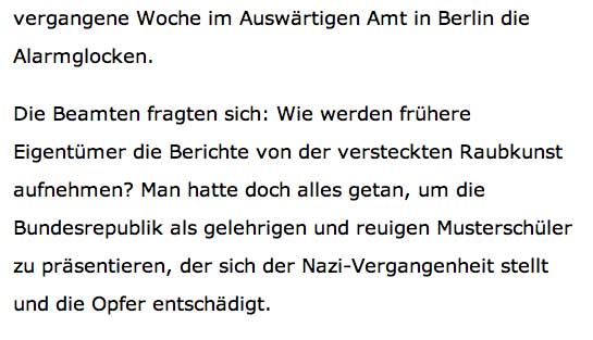 nach der Annahme: alles was zwischen 1933 und 45 an Kunst aus jüdischen Besitz im deutschen Umfeld den Eigentümer wechselte, ist auszuliefern, da nie frei von verfolgungsbedingtem Druck gehandelt worden sei.