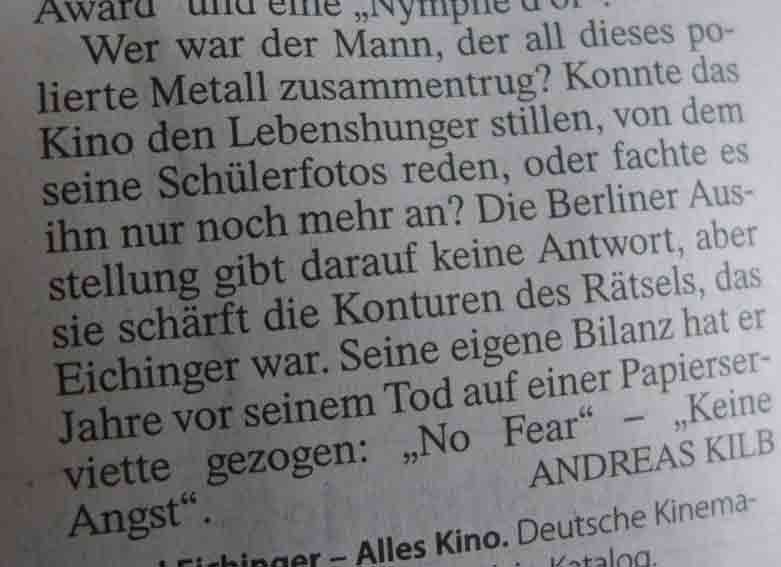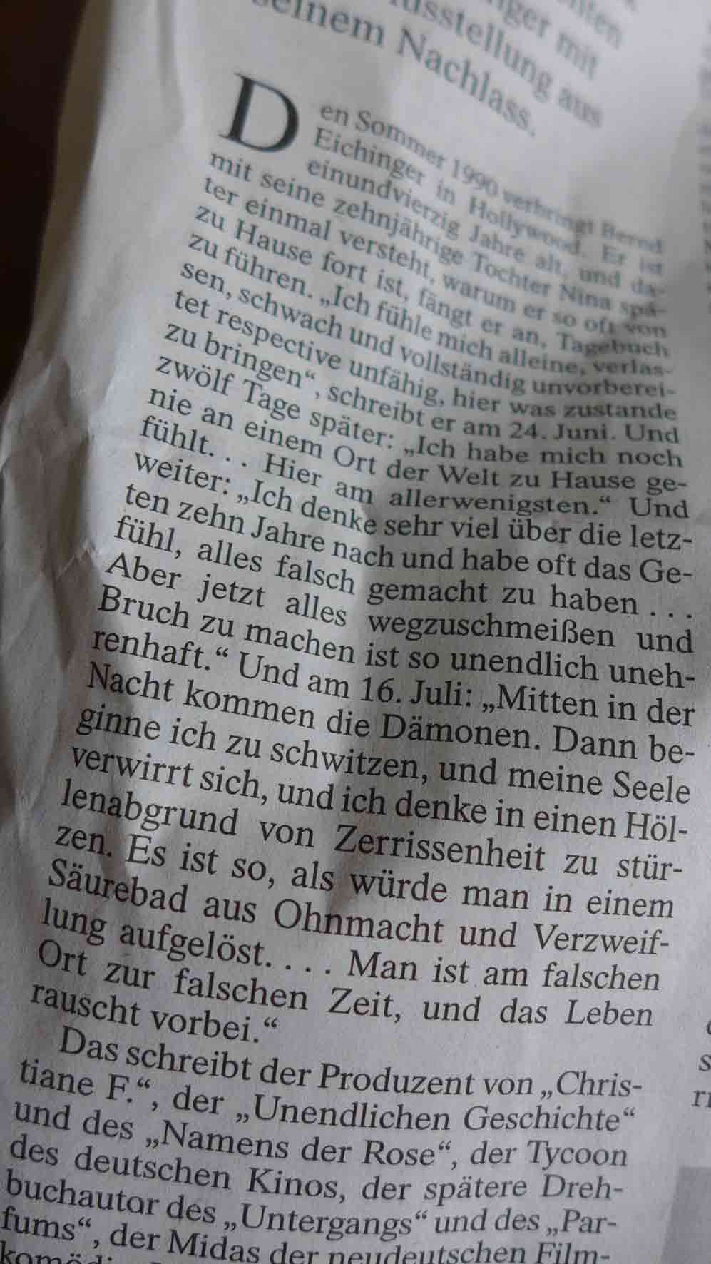 Der Bericht darüber in der FAZ beginnt mit einer Notiz Eichingers aus Hollywood, die sein Leben und Tun dort in Frage stellt, das er kurz vor seinem Tode in München bei uns mit einer seltsamen Bilanz versieht. Er, der Hollywood versuchte nachzumachen und zu erobern, beschreibt beim grössten Antipoden dieses Systems sein Vorbild als Produzent in den frühen gemeinsamen Jahren? auch dieser kleine Zetttel ist in Berlin nun zu sehen. 5 Wochen vor dem Tode ein Fazit erstaunliches. Gestorben ist er dann wieder In Hollywood.