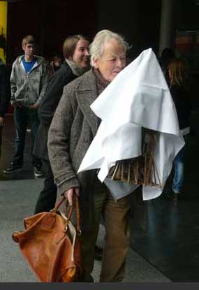 auf dem Weg in die Kinemathek zur Projektion von NACHT und TRAUM aus Anlass der Turmerrichtung (Modell im Arm) in Nossendorf. Mit der Tasche im alten Stil.
