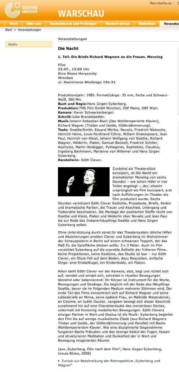 Aber in Deutschland muss sich die solitäte Darstellerin dieser NACHT, Edith Clever, mehr als 30 Jahre danach in einer der grossen Zeitungen noch immer rechtfertigen, dass sie das und wie sie es gemacht hat und sie versucht entschuldigend hinzuweisen, dass sie auch noch für was anderes steht, wie um Ablass bittend, damit sie noch vorhommt.