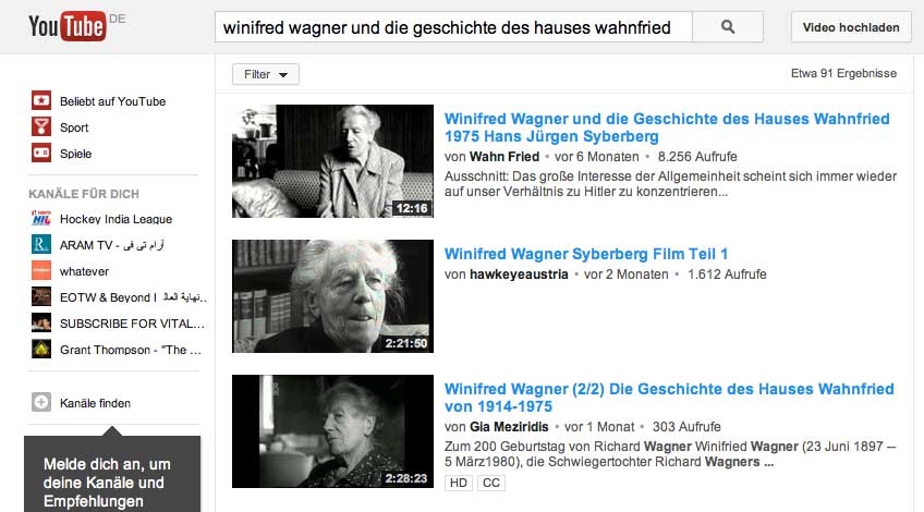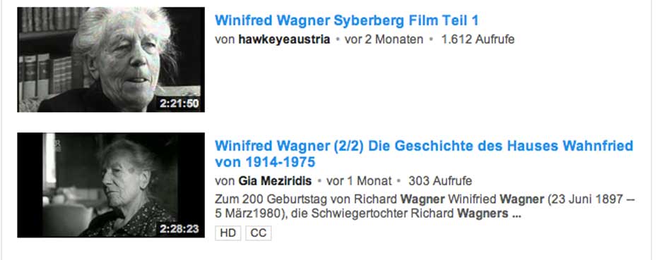 Die Winifred Wagner in voller Länge von 5 Stunden im Internet bei you tube. Also unberechtigt und mit über 2000 Aufrufen das sind bei verkauften DVDs 25 000 Euro, dazu die Aufforderung zum Herunterladen. Da vom BR geklaut, wird auch der ein Interesse haben dies zu verfolgen.