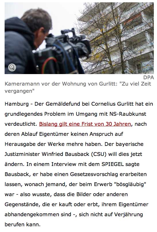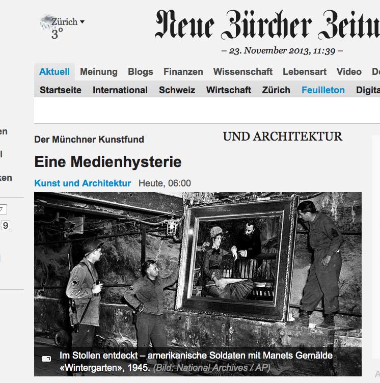 Der Artikel löste eine Medienhysterie von seltenem Ausmass aus; der Fall wurde international breit übernommen: Ich war plötzlich der ganz grosse Bösewicht. Jede Zeitung stürzte sich auf das Thema ohne jegliche Rücksicht auf präzise Information. Es hagelte Wünsche nach Interviews. Die Titelseite des deutschen Boulevardblattes «Bild», erschienen auch am 4. November, lautet «Kunst für 1 Milliarde Euro. Nazischatz in Müllwohnung entdeckt», ebenfalls begleitet von einer Foto Hitlers. Andere Schlagzeilen gipfelten in «1500 von den Nazis geraubte Kunstwerke aufgetaucht, die Spuren führen nach Bern». Ein Westschweizer Radio lässt noch am 12. November wissen: «La Suisse au cœur de l'affaire des 1500 tableaux volés par les Nazi.»