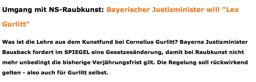 her. ⋅Vor zwei Jahren haben die deutschen Behörden in der Münchner Wohnung von Cornelius Gurlitt rund 1400 Kunstwerke vorwiegend der klassischen Moderne beschlagnahmt. Viele dieser Werke waren offenbar in der Nazizeit als «entartete Kunst» beschlagnahmt worden. Sie stammten aus der Sammlung des Kunsthändlers Hildebrand Gurlitt, der von den Nazis mit der Veräusserung von beschlagnahmten Kunstwerken beauftragt worden war. Die Aufdeckung des Falls durch ein deutsches Magazin provozierte einige Aufregung in den Medien, sie wirft auch rechtliche Fragen ohne Ende auf und lässt Emotionen hochkochen, wie die zahlreichen Reaktionen von verschiedenster Seite zeigen. Die NZZ hat in den vergangenen Wochen mehrfach über die Entwicklung des Falls und seine politischen Aspekte berichtet (laufend ab 4. 11.), eine Einschätzung der bis heute veröffentlichten Kunstwerke aus der Sammlung vorgenommen (6. 11.), sich zu der überaus schwierigen Rechtslage geäussert (5. 11. / 7. 11.), die Beschlagnahme «entarteter Kunst» aus kunsthistorischer Perspektive beleuchtet (7. 11.) oder die Geschichte des Kunsthändlers Hildebrand Gurlitt in einen historischen Kontext gestellt (13. 11.).