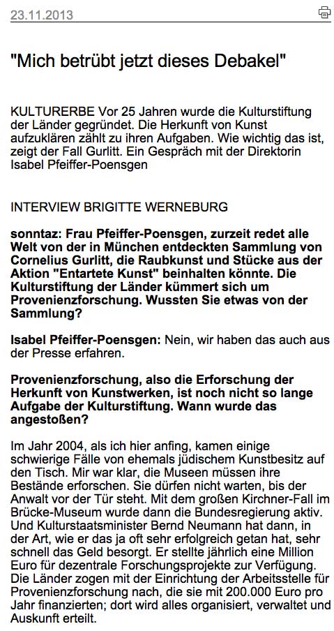 Auch in der Schweiz lässt keine Zeitung das Thema aus, «Argus», eine Presse-Beobachtungs-Agentur, bei der wir auf Erwähnungen der «Galerie Kornfeld» abonniert sind, schickt für die Tage vom 4. bis 14. November 298 Zeitungsartikel sowie 28 Beiträge in Radio und Fernsehen. In der Flut finden sich auch Artikel und Interviews der beiden eidgenössischen Spezialisten für geraubte Kunst der Jahre von 1937 bis 1945, Thomas Buomberger und Andrea Raschèr. Beide kommen zum gleichen Urteil: Juristisch sei Kornfeld nichts vorzuwerfen, aber die beiden erheben den Moralfinger.