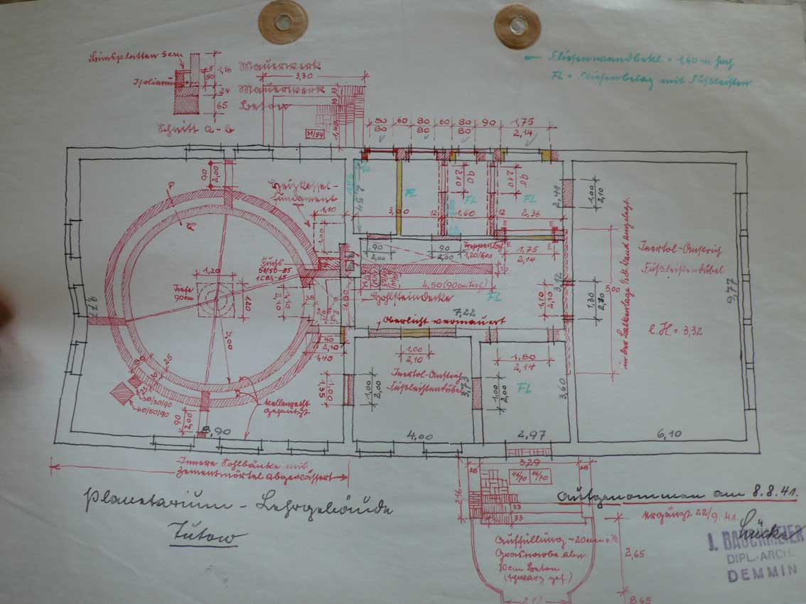 Die Nachfolge der Ulanen wurde dann die Fliegerstaffel von Tuto. Und die Garnisonsstadt der leichten Kavallerie des Kaisers Demmin gab Hermann Göring die Ehrenbürgerschaft. Ein anderes Thema -heiss und notwendig gerade noch mit verstreuten Spuren lebendiger Zeugen greifbar- im Haus der Geschichte von Demmin, Demnächst. Die Zeichnung von Jochen Bauchmeier als Erbauer des ganzen Geländes -mit hier dem Planetarium(!) des Flughafens von seiner Hand- ist als Kopie noch vorhanden(das Original gab er an den russischen Kommandanten gegen ein Pferd).