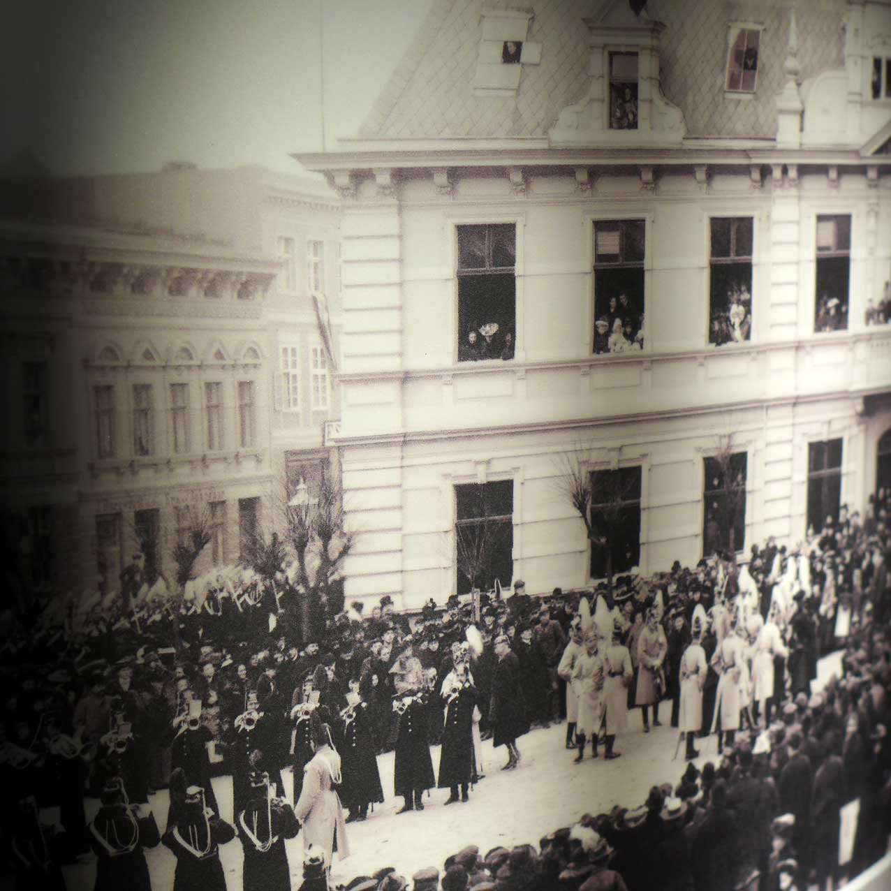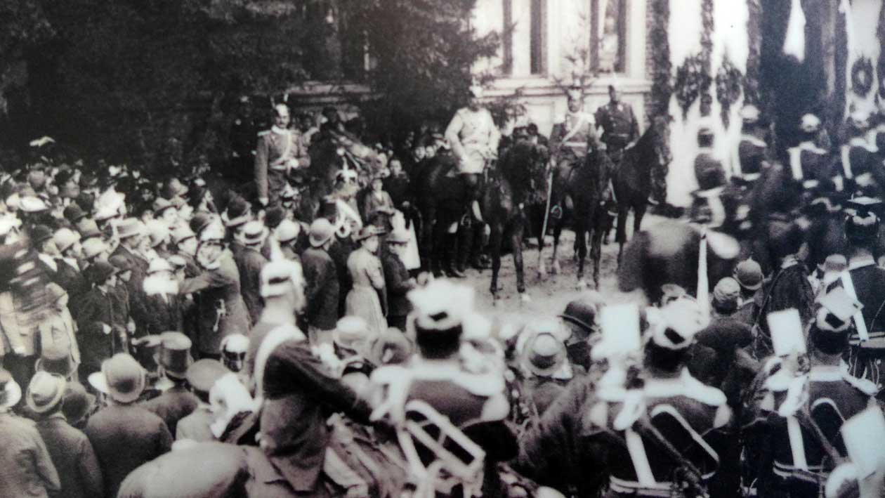 Der Besuch des Kaisers vor dem Rathaus mit noch intaktem Marktplatz rundum