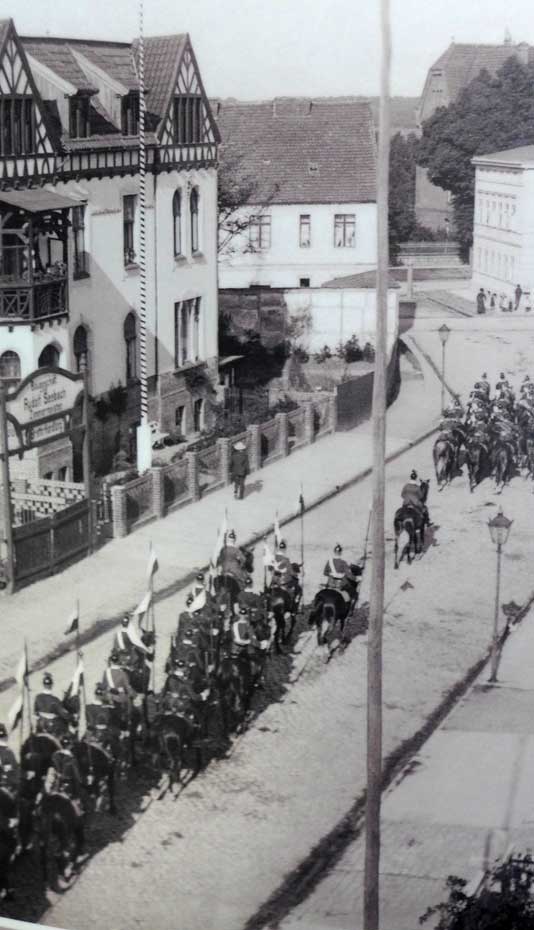 Das war das tägliche Leben Demmins bis 1914. Der Auszug der Ulanden zu Pferde wue Zinnsoldaten der Väter in echt.