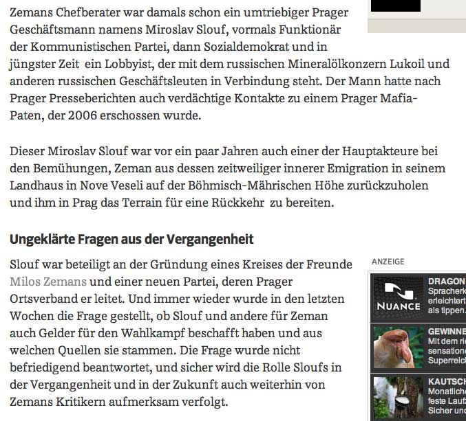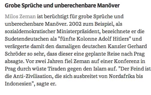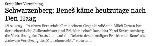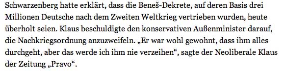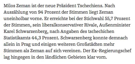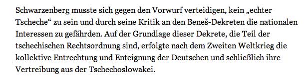 Der gesamteuropäisch denkende Kandidat, alter Schulen Europas also, wird von den jungen Wählern in Prag und den anderen grossen Städten Tschechiens und Böhmens begrüsst. Und damit den Fluch zu bannen, der die Geschichte dieses Landes immer noch fesselt. Sich materiel durch Raub zu bereichen und damit eines Teils ihrer gemeinsamen Geschichte Europas zu entledigen oder zu verlieren, mehr als zu gewinnen, wenn es um Freiheit geht der Kulturen. Die zusammen nur in Europa gelten. Er hat es gewagt zu sagen, was zu sagen ist, so sehr sich die anderen noch krümmen unter den Lasten dieser Geschichte. Der Gewinn liegt woanders. Dieser Karel Fürst Schwarzenberg begann als Kind und junger Mann in Wien belächelt als einer der Ärmsten aus enteignetem Böhmen in blossen Stümpfen in löchrigen Schuhen -he went next to the shoes-bis er adoptiert das reiche fränkische Erbe antrat und damit den Weg eines, der am eigenen Leibe erfuhr wie alles, was ist, zu lehen gegeben ist, zur Haltung es zu wissen.