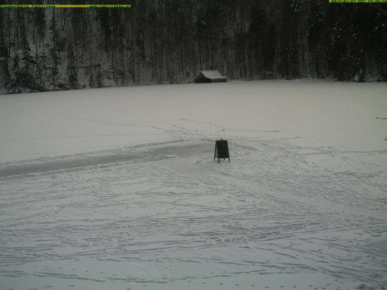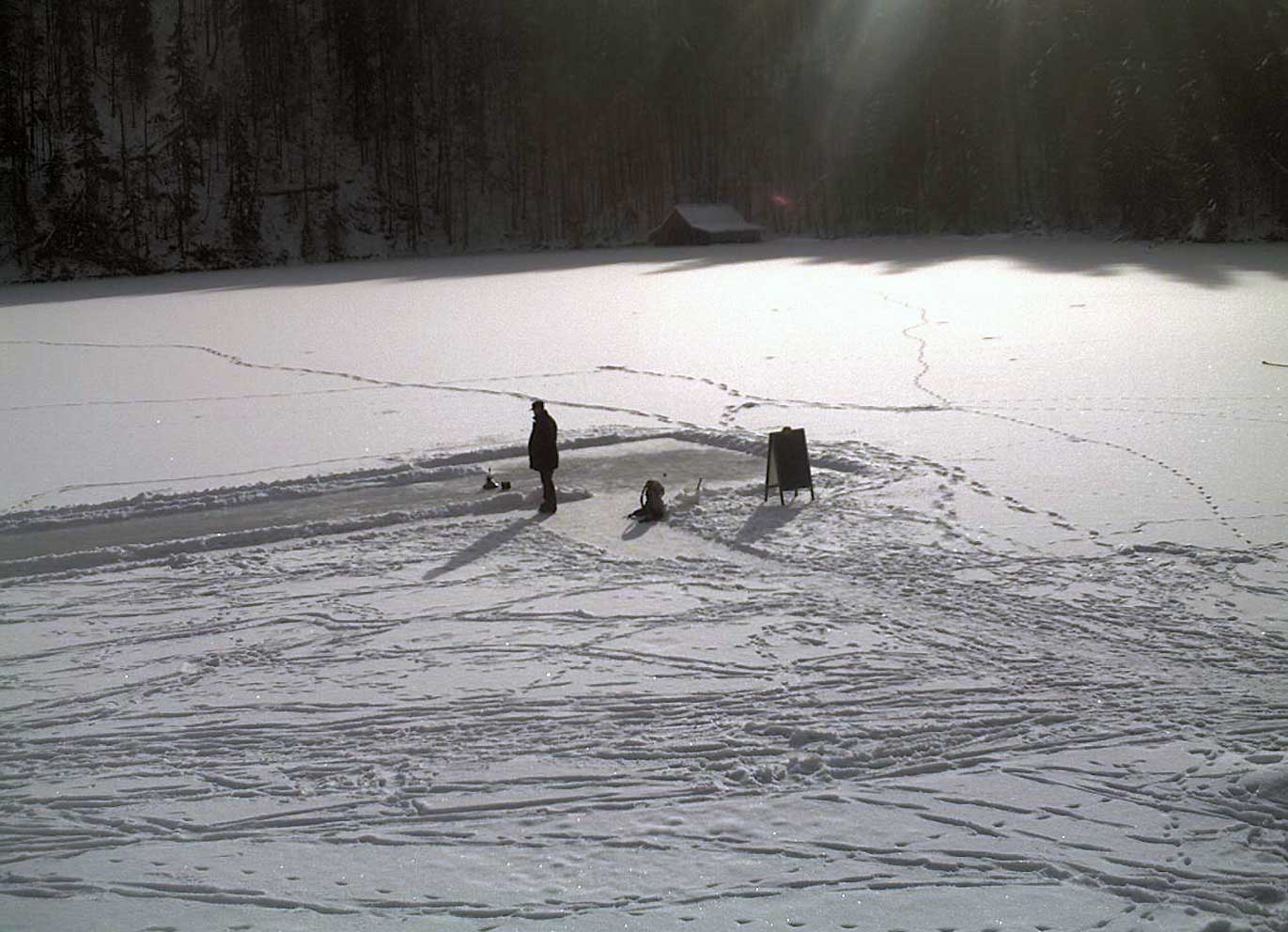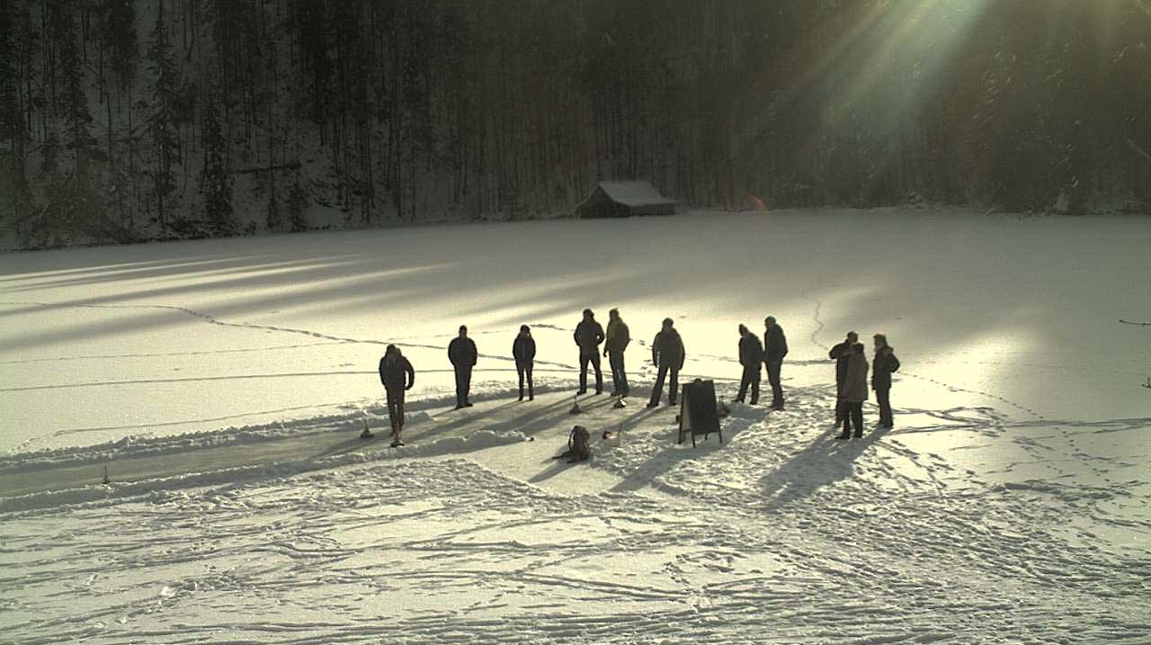 am fernen Toplitzsee sehen wir die Eisbahn . Es ist 10 Uhr vorbei und die Sonne schon hoch und klar.
