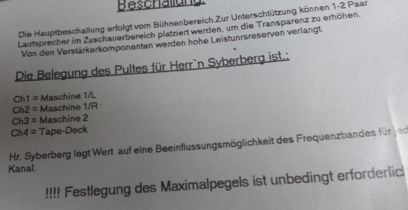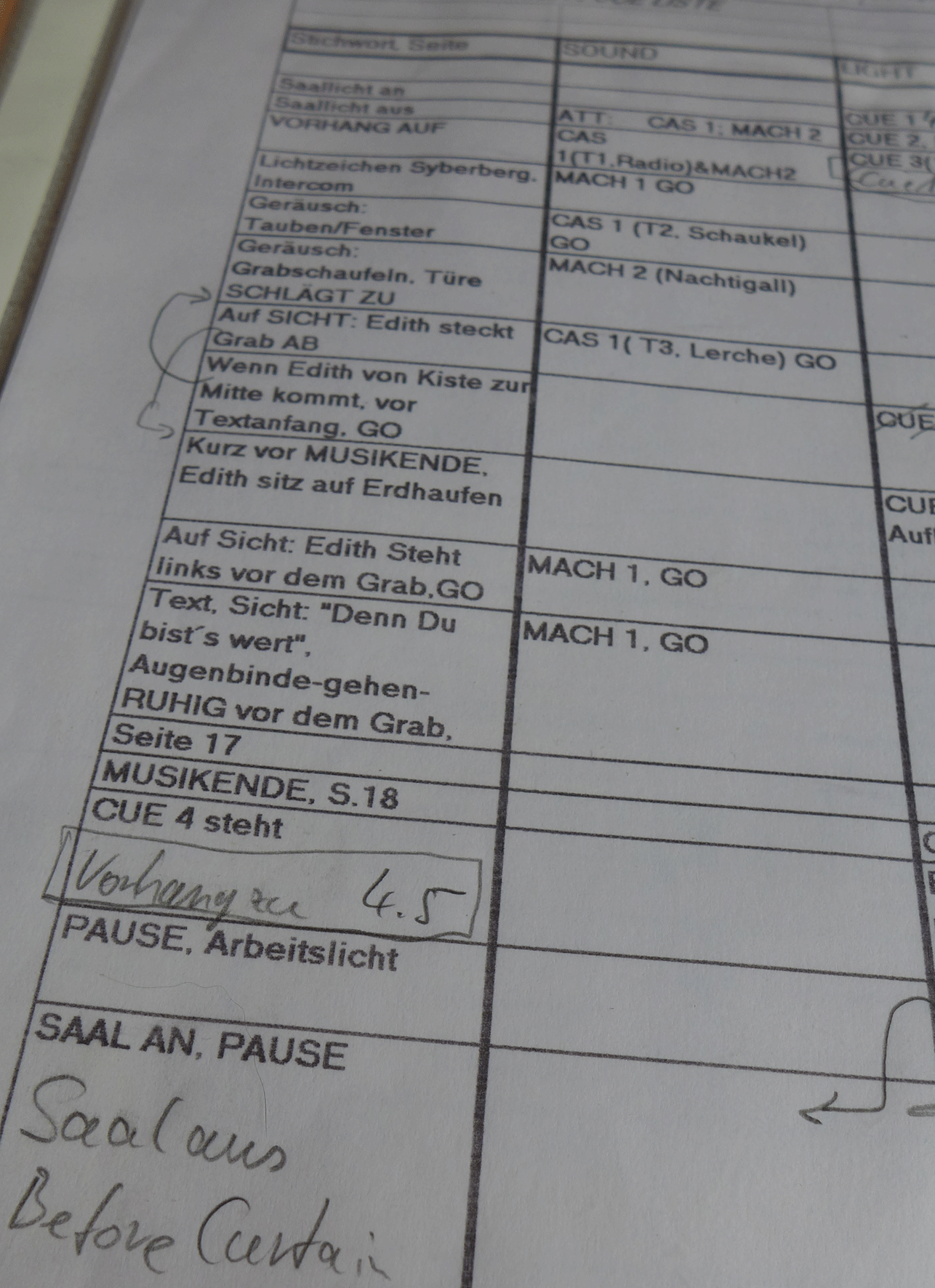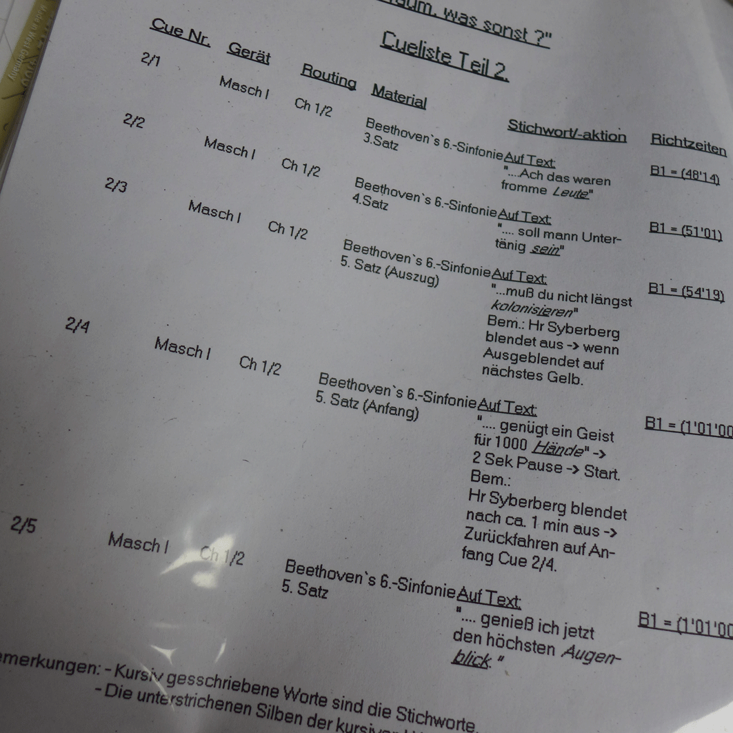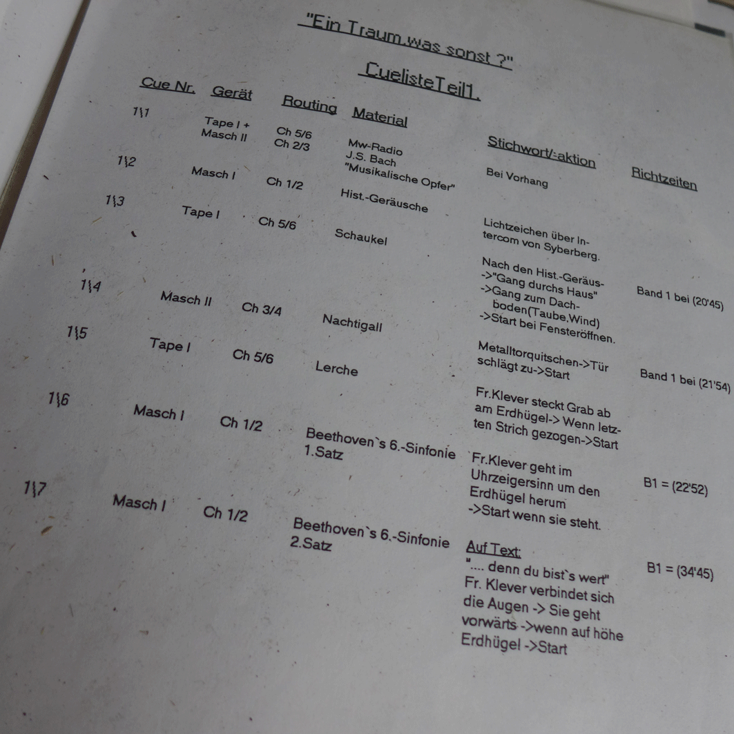 Nachdem ich mich immer um die Einsätze Ton, Licht, Stimmungen gekümmert hatte ich die Regieanweisungen, Stimmungen etc. immer gedanklich gespeichert. An die Erstellung der Toncollage im Tonregieraum des Hebbel Theaters kann ich mich noch gut erinnern, waren lange Nächte, teilweise sehr bewegend aufgrund der Toninhalte.