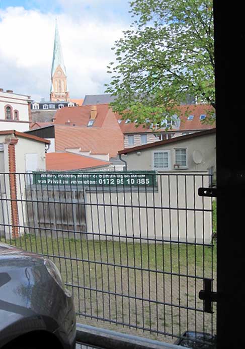Im Hotel der Blick in den Hinterhof des DDR-Graus wird belohnt durch den Blick auf den Turm des Parsifal-Doms der Nacht aus dem Parkhaus daneben. Und wir sind wieder im Leben - aber ausgestattet von innen mit Bildern nun in alle Welt, die uns bestätigen, dass wir noch sind.