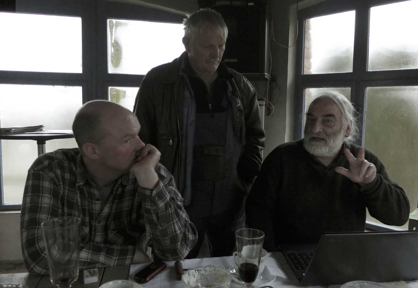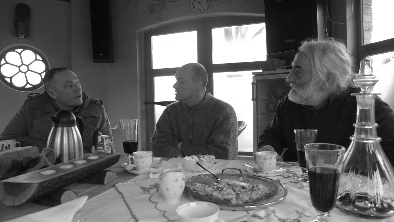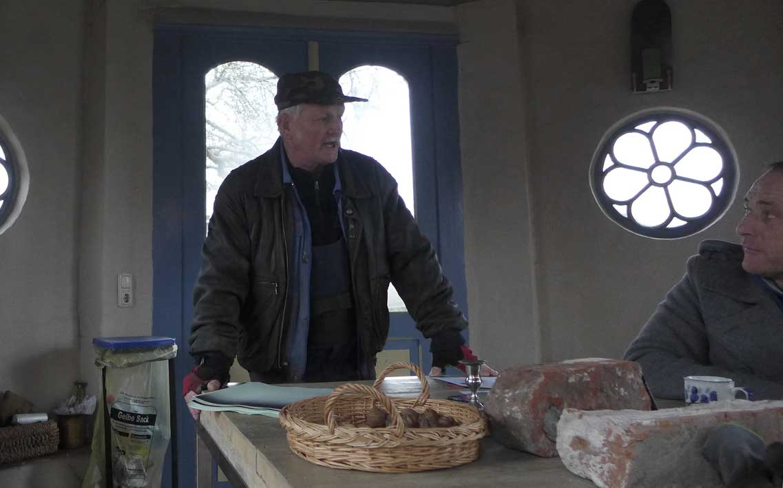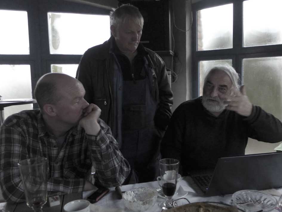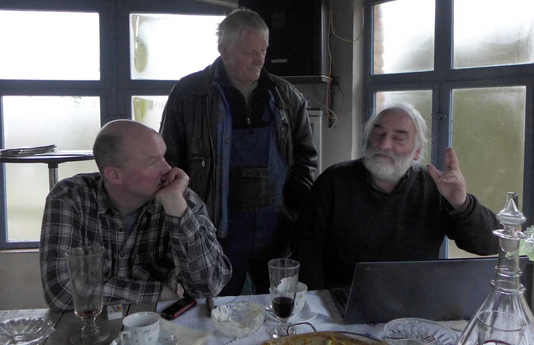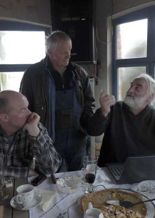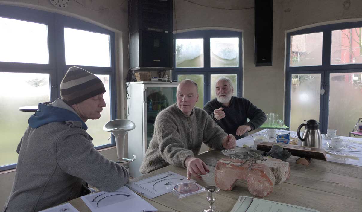Fontane 2013, Endstufe der Häuser und Geschichten. Esch, der Antiquitäten Händler. Günter der Maurer und Clemens, der Historiker der Region als Gruppe des Bildes. Im Pallion des Gartens an den Fundamenten der Heiligen Geistkirche in Demmin nach 1945 abgerissen.