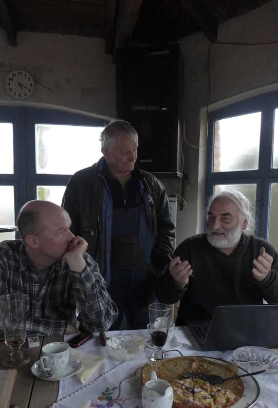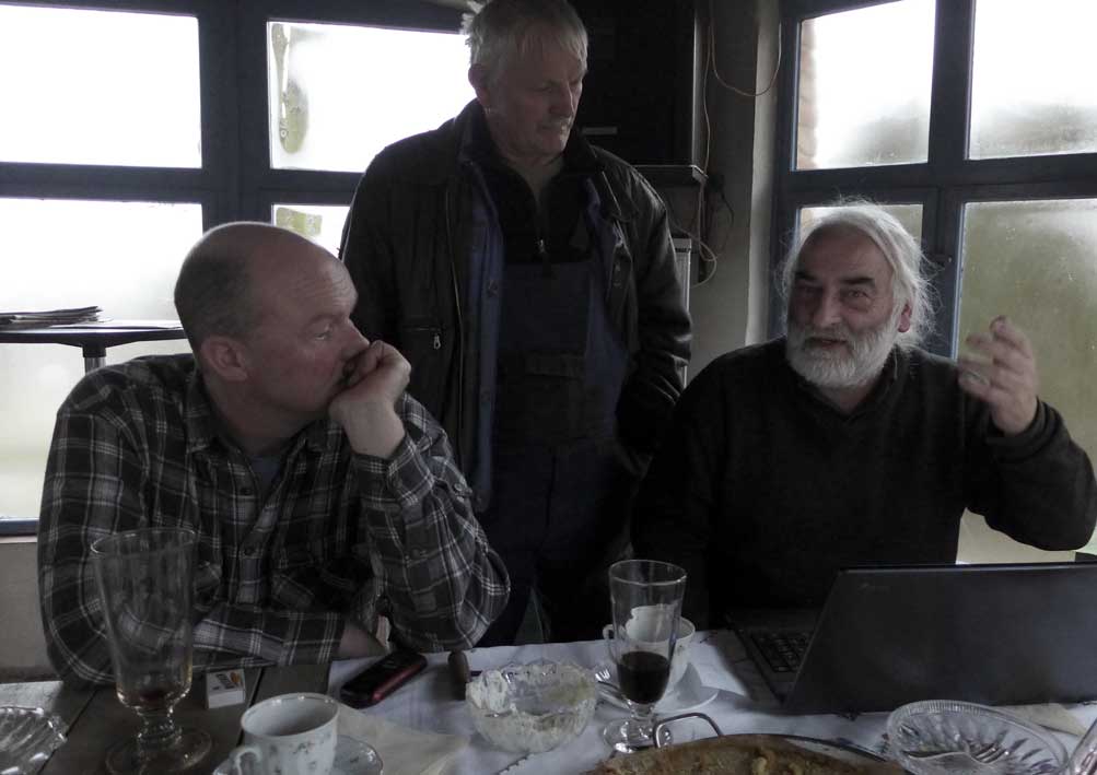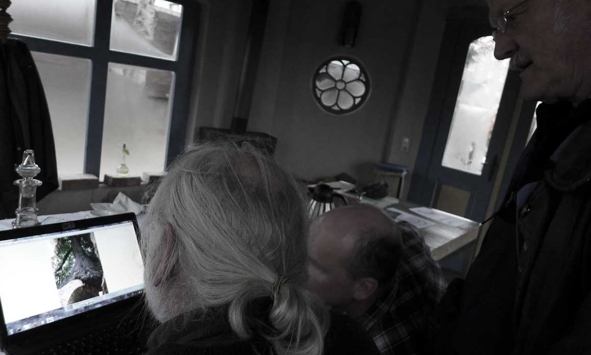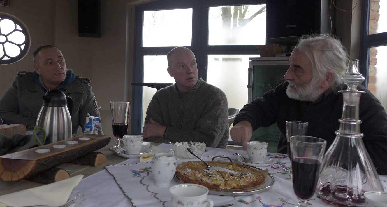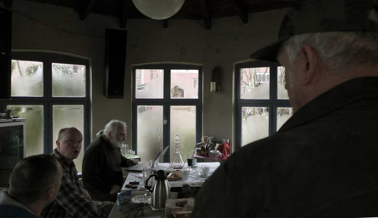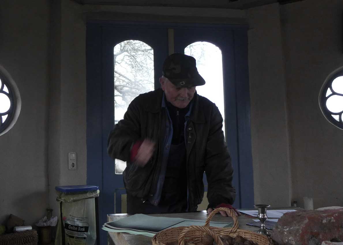 Fontane 2013, Endstufe der Häuser und Geschichten. Esch, der Antiquitäten Händler. Günter der Maurer und Clemens, der Historiker der Region als Gruppe des Bildes. Im Pallion des Gartens an den Fundamenten der Heiligen Geistkirche in Demmin nach 1945 abgerissen.