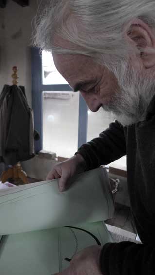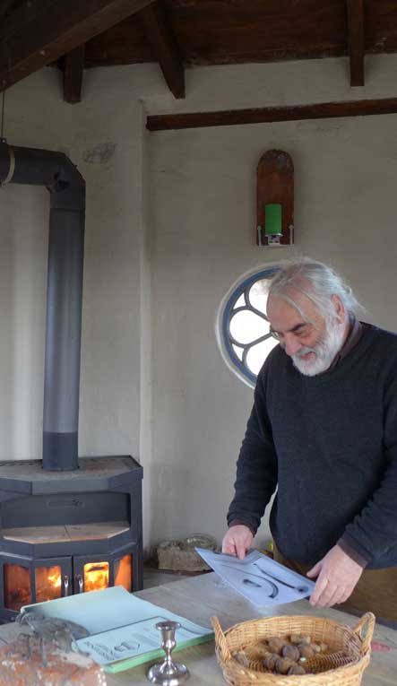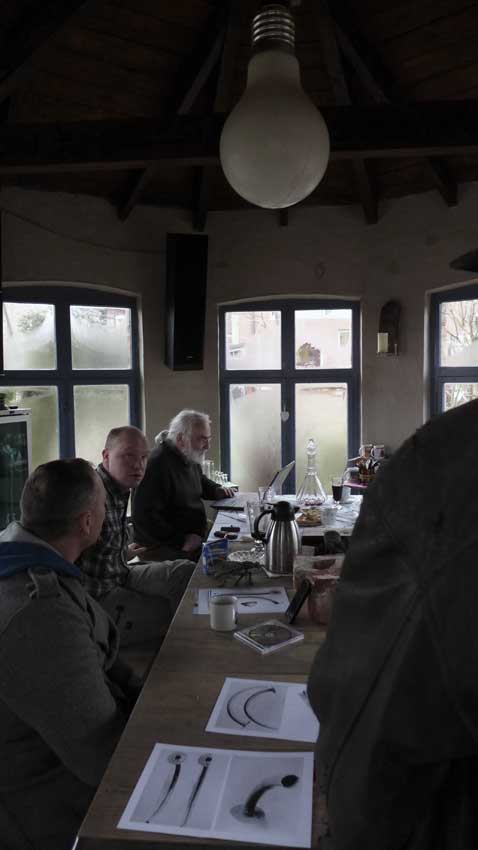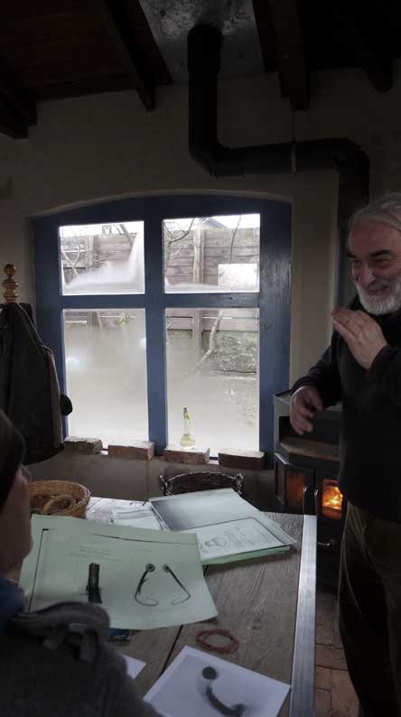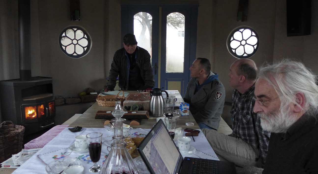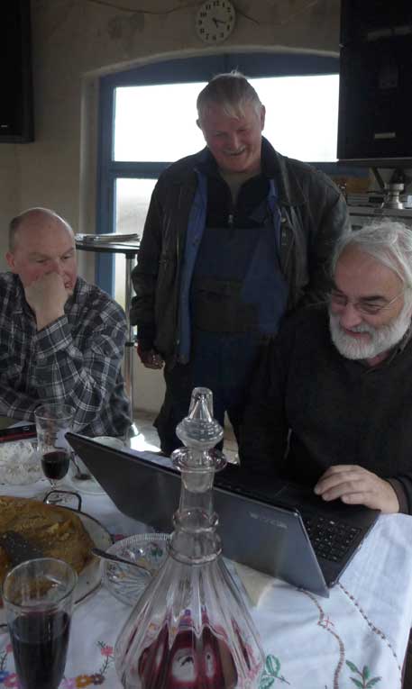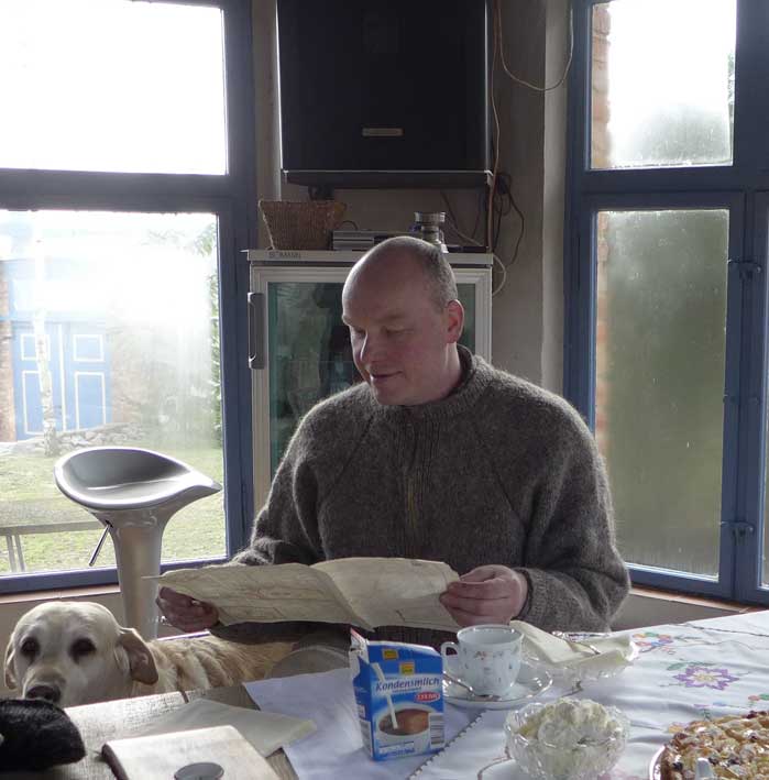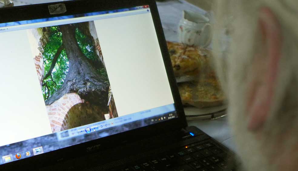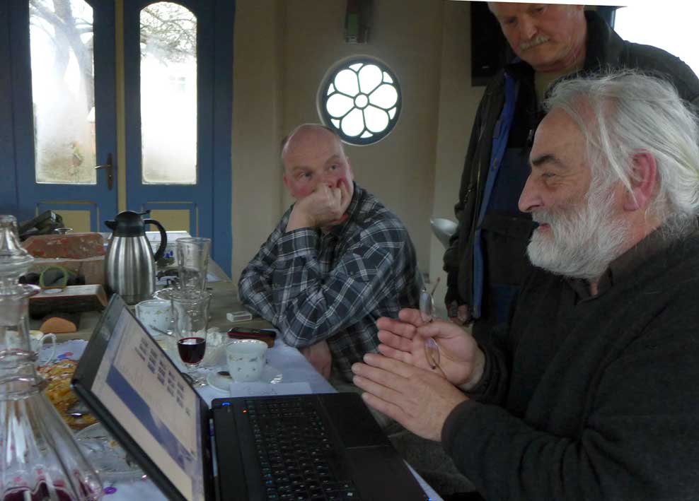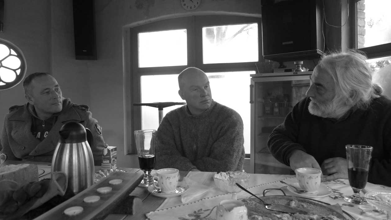 Fontane 2013, Endstufe der Häuser und Geschichten. Esch, der Antiquitäten Händler. Günter der Maurer und Clemens, der Historiker der Region als Gruppe des Bildes. Im Pallion des Gartens an den Fundamenten der Heiligen Geistkirche in Demmin nach 1945 abgerissen.