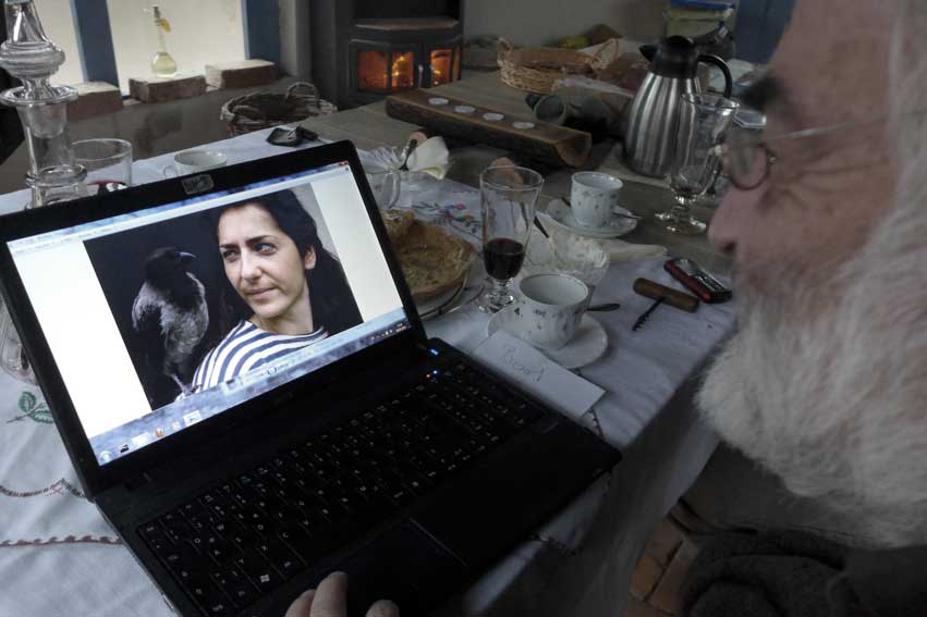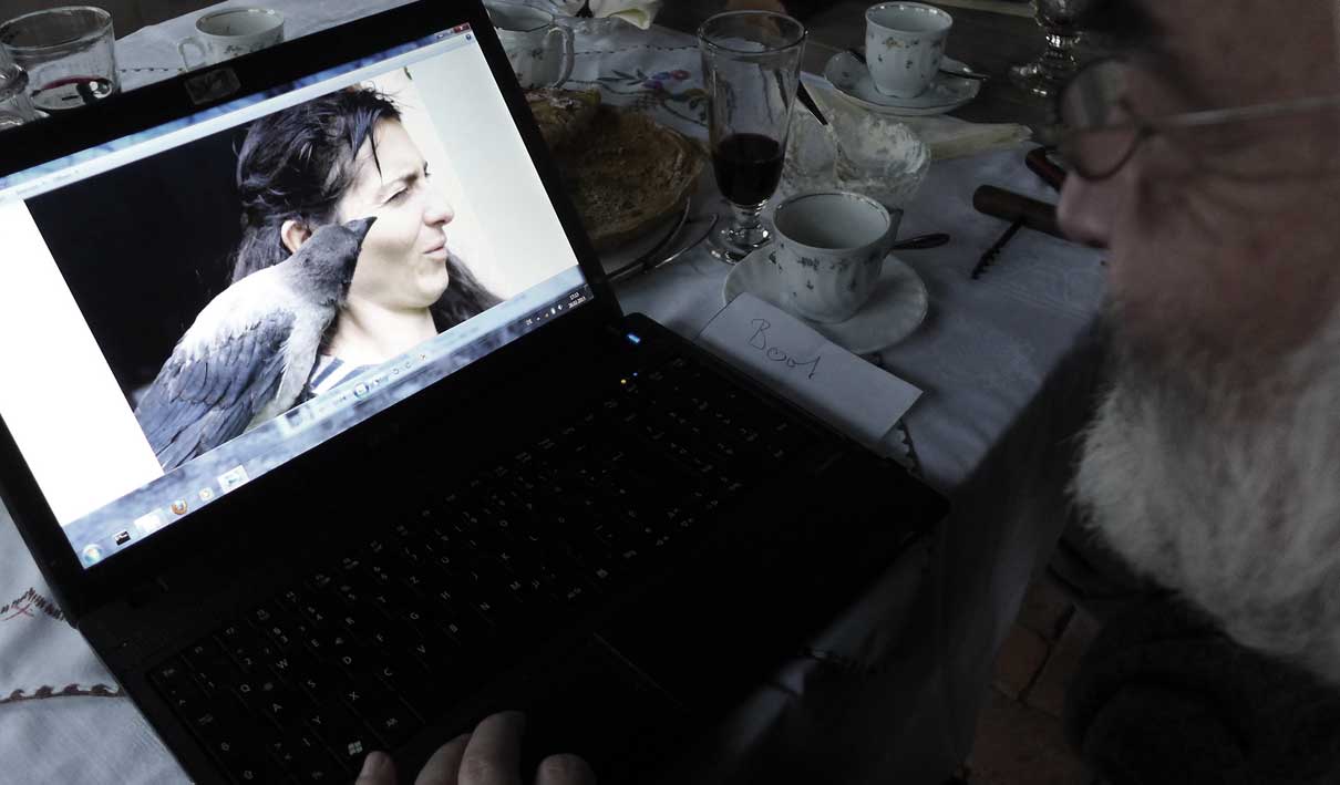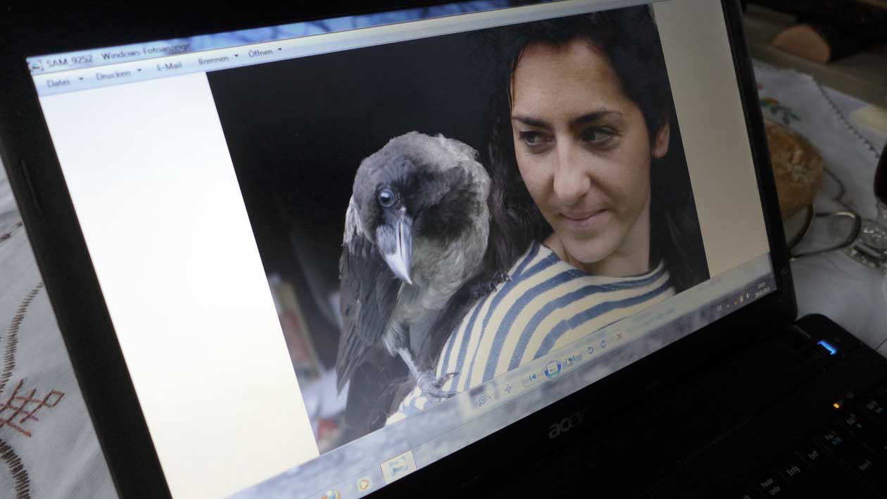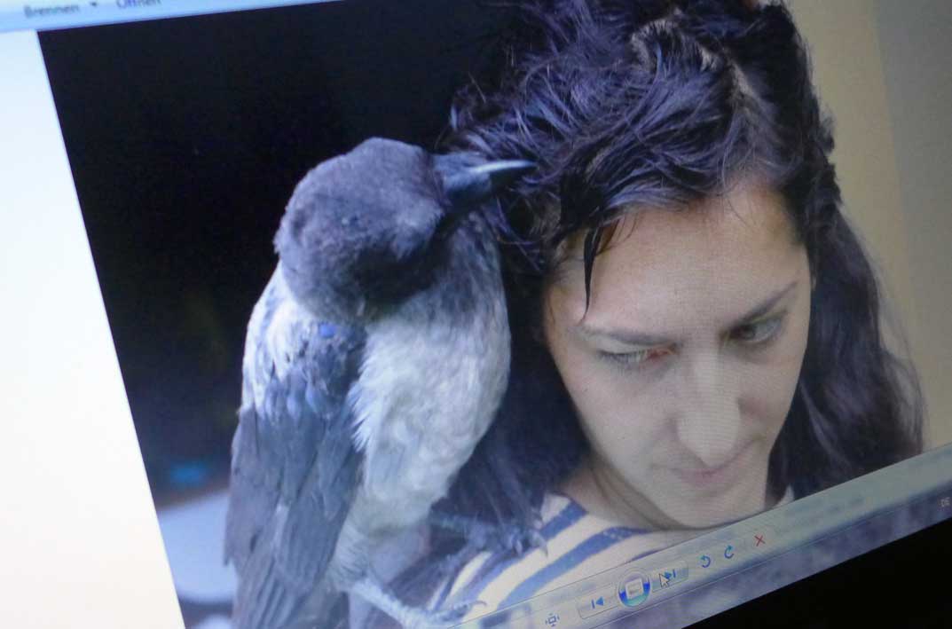 eine Krähe als Junge gefunden flog immer mit beim Spatzierengehen vorne. Unten der Hund-oben die Krähe. Beim Essen am Telle auf dem Tisch.