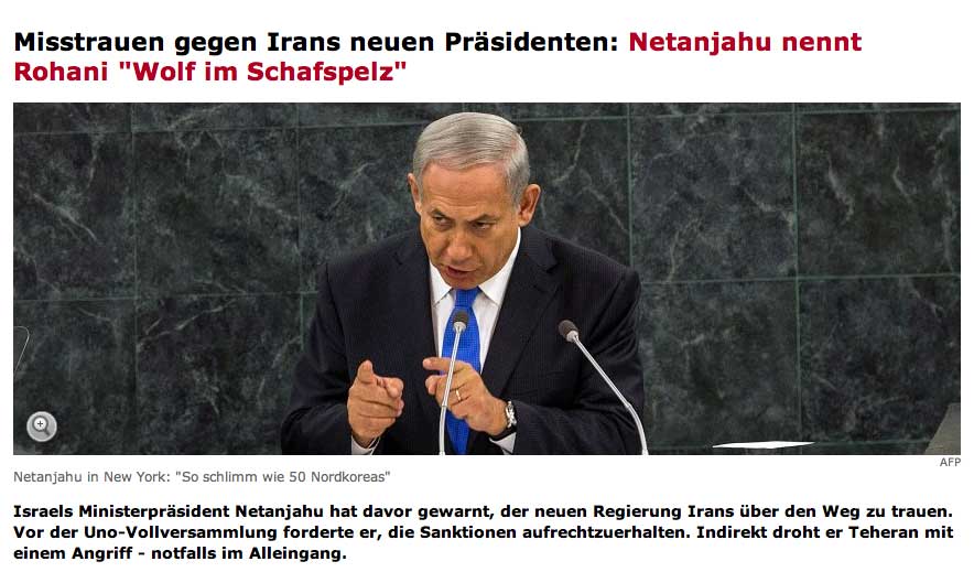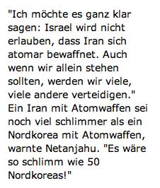 Teheran (dpa) – Iran hat die Äußerungen des israelischen Ministerpräsident Benjamin Netanjahu vor der UN-Vollversammlung in New York als absurd zurückgewiesen. Netanjahu hatte gestern dem Iran indirekt mit einem Militärschlag gedroht, falls das Land sich atomar bewaffnen sollte. Im Notfall wolle Israel diesen Angriff auch alleine durchführen.