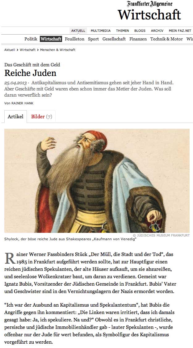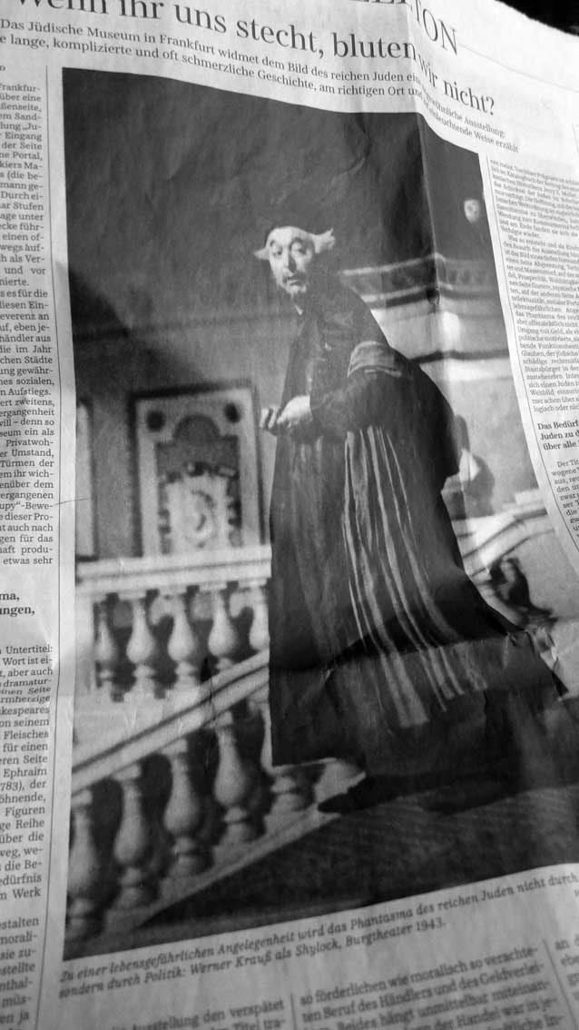 Das Foto als Anmerkung des in Frankfurt zeigten sehr informativ. Aber schon der Text aus der Zeit der damaligen Zeitungen hier unten zu lesen,wurde nicht dazu gesetzt (hier aus Joachim Kaisers Text "Ist Shylock noch zu retten")