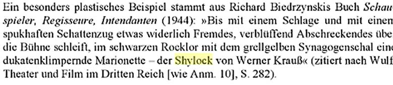 In einer ganzseitigen Besprechung der Süddeutschen Zeitung sehen wir 3 spaltig und doppelter Höhe der Sylock von 1943 von Werner Kraus im Burgtheater als offizielle Version der Rolle und von dem Darsteller des Jud Süs gezeigt. Im Film von Harlan spielte er auf seinen Wunsch alle Juden.