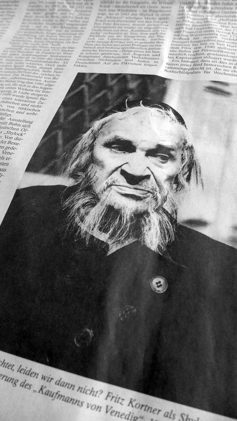 Die Frankfurter Allgemeine wählte zu einem einseitigen Bericht der Ausstellung, wieder mit viel Meinung und wenig Übersichtlichkeit, als einiges Bild der Ausstellung ein Kortner-Fotos gross als Shylock. Aber nun mit jüdischer Maske und Bart. Es war im Gefolge des Versuchs von 1966 kurz darauf noch mal der ganze Shylock in einer Fernseh--Version des ganzen Kaufmann von Venedig, den man wieder wohl mit Bedacht in Frankfurt jetzt nicht zeigte. Schon Joachim Kaiser, der Kenner und Grossmeister der Theaterkritik aus den Süddeutschen Zeitung, wusste, warum er den Film -Versuch aus den Kammerspielen von 1966 vorzog. Wieder also statt Berichterstattung, ein Eingrif. Dazu kommt, mit Kortner Fotos gibt von Stefan Moses, wie wohl sonst von keinem anderen. Die nämlich zeigen, um was es hier geht.