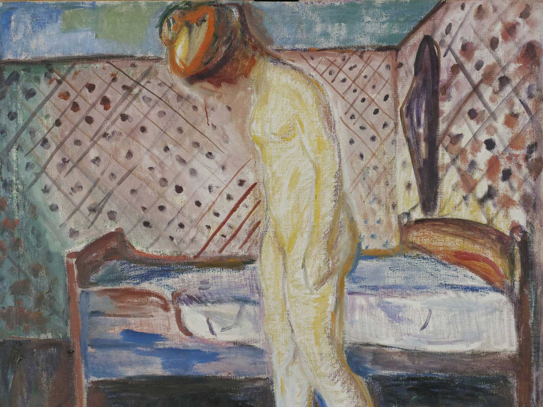 so sie und andere vor verschiedenen Wändmustern mit Bett