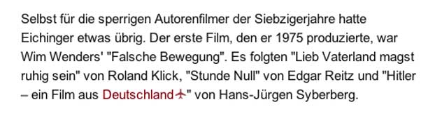falsch. Der erste Film hiess KARL MAY und das war 1974 sein Debut. Als er den Film in doppelter Länge des budgetierten rettete. Dann war er der Herstellungsleiter des HITLER-Films (1977) und beim PARSIFAL(1981/82) wieder dabei. Da war nicht übrig und nebenbei.