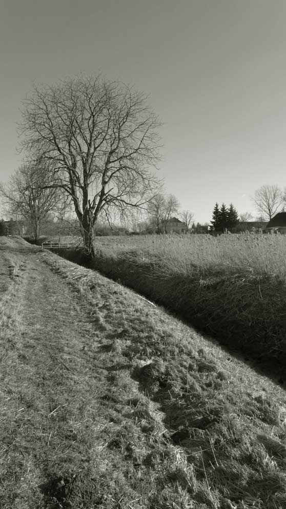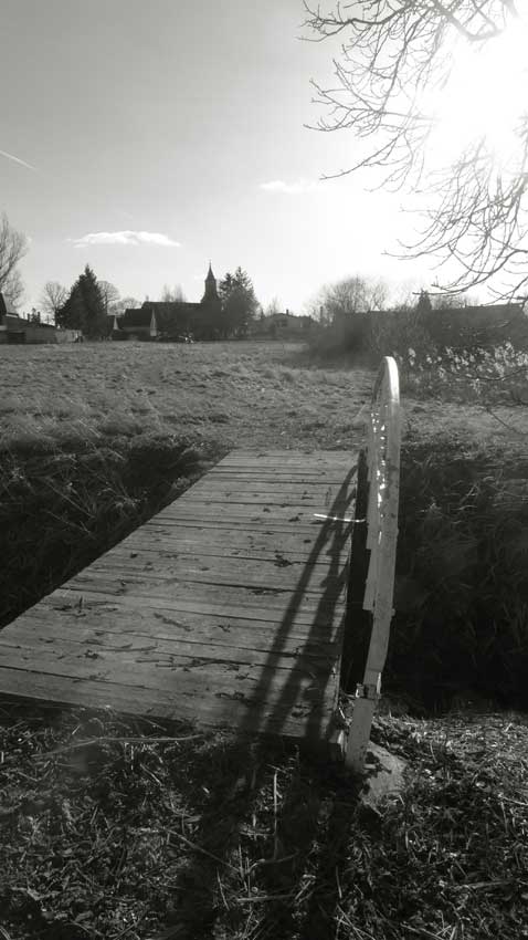 Das ist der Weg aufs Feld hier´ wie er war. Über die Brücke, gut zu gehen, auch nebeneinander, zu reden. Mit Abstand zum Graben. Denn der Graben soll frei bleibe, rein vom Giessen der Spritzfahrzeuge.