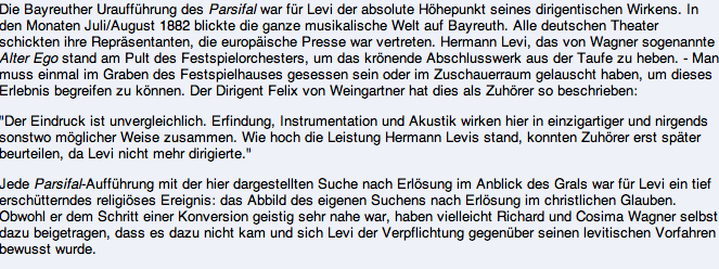 Was tut Bayreuth im Jahre Richard Wagners (200 Jahre Geburt) und seines Parsifalsdirigenten -vor 130 Jahren die Premiere dirigiert von Hermann Levi- für diesen Vertrauten Richard Wagners und Künstler hohen Grades.