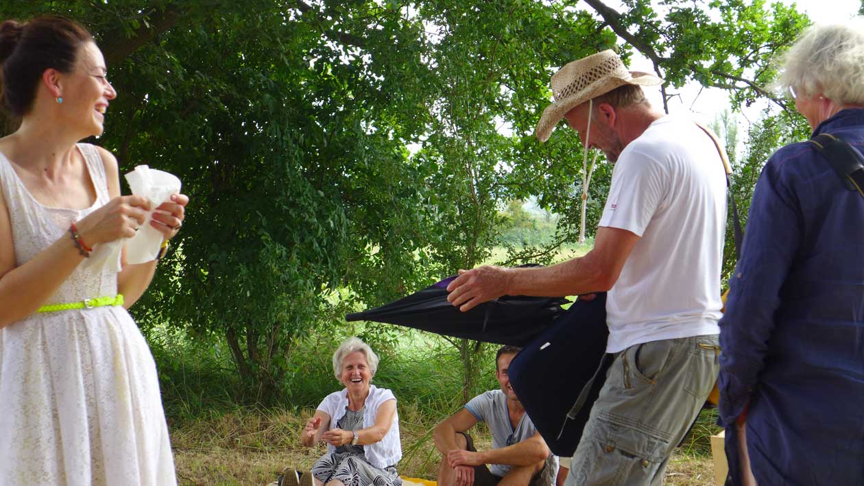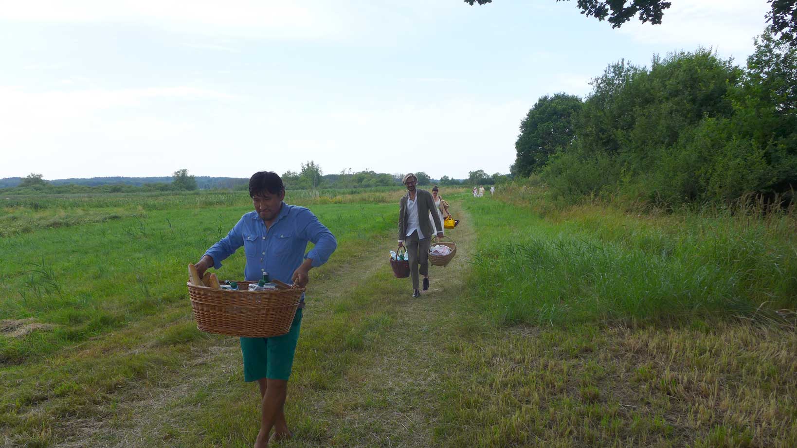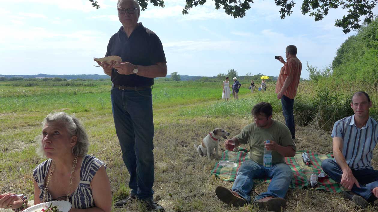 Regie auch alles chronologisch, die Wahl des Platzes über dem Fluss, unter den Eichen mit dem Turm hinter den Feldern, die Abfolge der Stationen, der Zufall der Besetzungen, und stille sein. nur leitend sehen., dass es läuft.