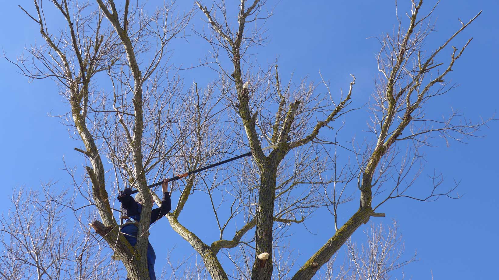 Das Profil der Bäume mit nach oben geschnittenen Ästen hier bekämpfend, tun wir alles sie, die überlebende Weide, die durch die Umstände Verstümmelte, in der Mitte des Hofes und vor Augen täglich. zu retten.