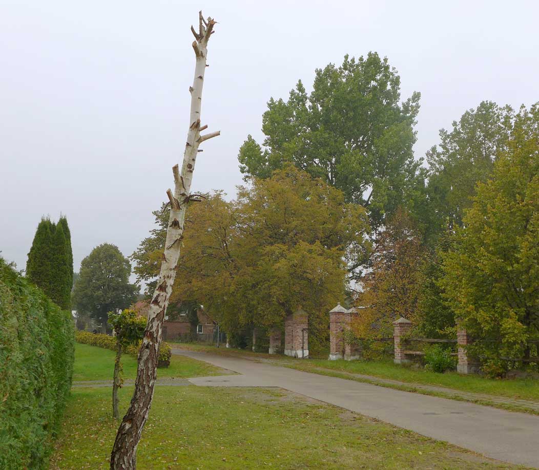 Vor 10 Jahren, als ich wiederkam, war die erste Tat die Wiedherstellung der Pfeiler und das Pflanzen der Linden wieder auf unserser Seite. Damit war klar, wo die Grenze ist . Eigentum schützt. Das Tor blieb immer offen. Gemauert von Dirk, von gegenüber. Als er starb, fiel der esrte Baum bei ihm. Die Birke ist nun dran. Ilona, die Frau von Dirk ist die Tochter von Lottchen, die mit mir zu Schule ging, aus dem Osten gekommen.