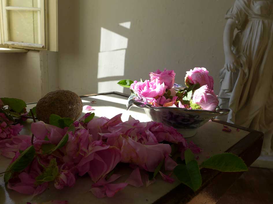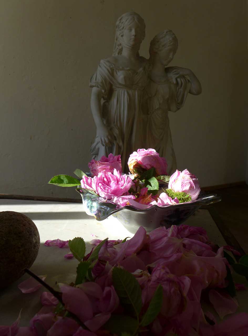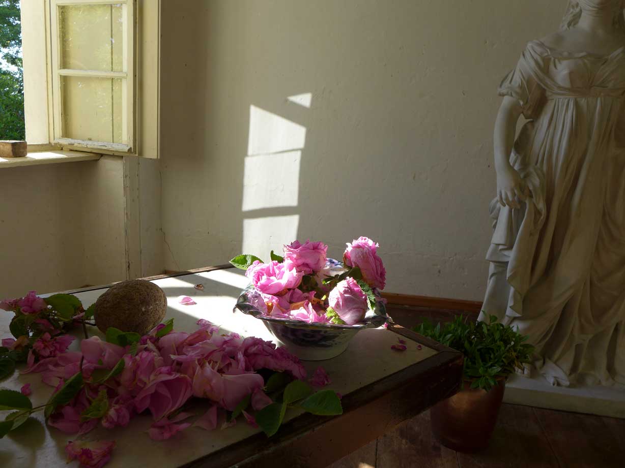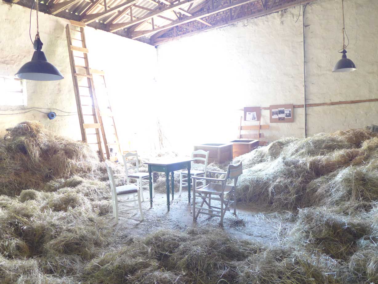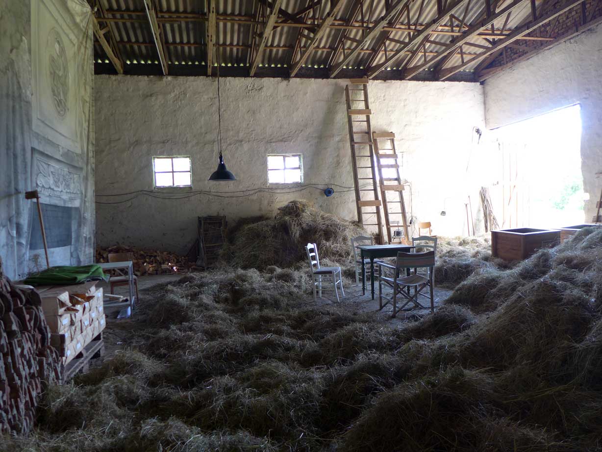 Und hier ist der Ort gut dafür. Früher für das Stroh für die täglichen Unterlagen und den Mist dann, und für die Kinder der Platz mit den Höhlen und Sprüngen von den Balken, dort wo das Schloss aus Berlin und des Kleist seinen Platz fand und die Sommerfeste mit Musik und zuletzt die Feier des Richtfests für den Turm. Und der Tisch in der Mitte jetzt war im Hitler-Film ein wichtiger