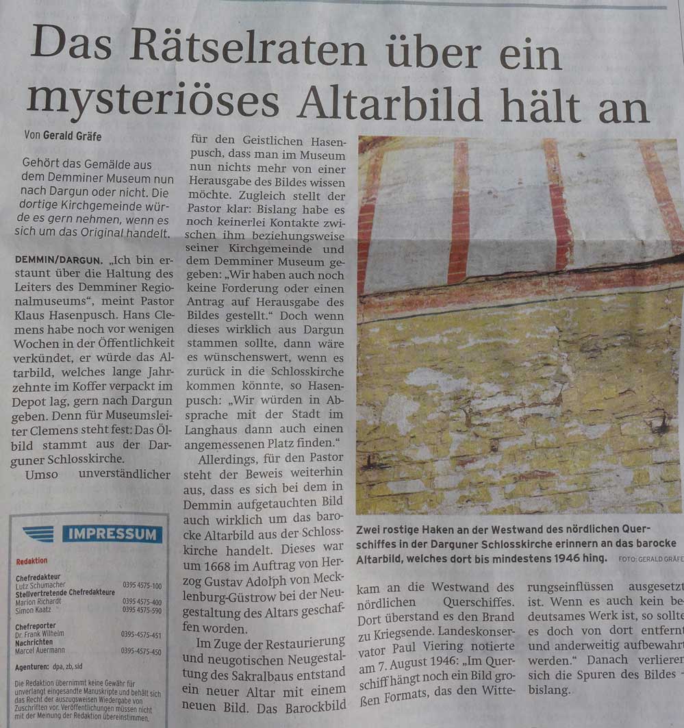 In der Zeitung auch wieder Nachrichten zur Kreuzigung in Demmin. Dem Museum nach dem Kriege übergeben. Es wären nun, wenn aus Dargun mit Datum und Stifter-Namen und Beschreibungen der Situation hinzugekommen von damals für das Museumsarchiv, auch und wieder Brände der Krieges hier wie da. Was beide Orte zusammenbände in diesem Bild?