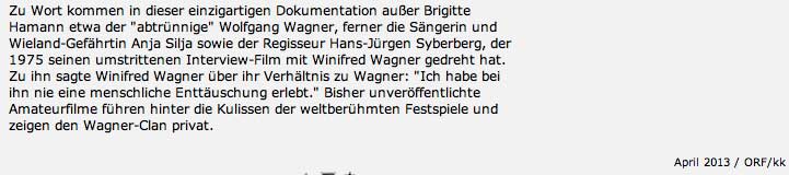Den originalen Film der Bekenntnissen von Winifred Wagner und die Geschichte des Hauses Wahnfried von 1914-1975wird man in voller Länge von 5 Stunden zum ersten Mal nun wieder nach 38 Jahren im Fernsehen am Geburtstag Richard Wagners(22. Mai) einmal und regional im BR sehen.