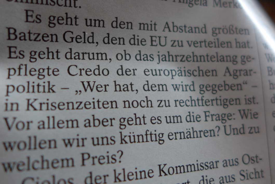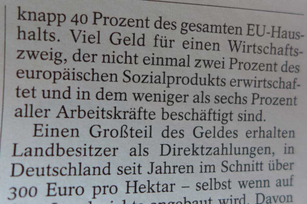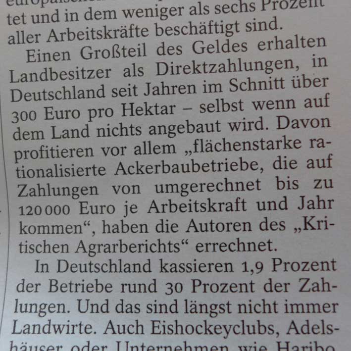 Und wir sitzen mittendrin. Der Landesbauernpräsdent unser Nachbar, fleissiger Lobbyist auf Seiten der Ausbeuter von Land und Tieren - und nun auch Mit-Spender des Turms und wir selbst, endlich wieder zu eigenem Boden gekommen, Verächter solcher Bewirtschaftung, und also begünstigt von diesen Subventionen mittendrin, wie rauskommen aus dem System.