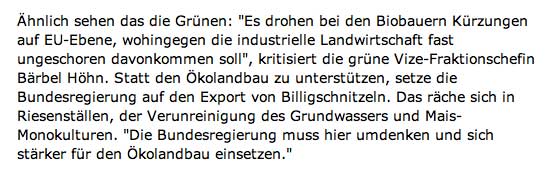 Ähnlich sehen das die Grünen: "Es drohen bei den Biobauern Kürzungen auf EU-Ebene, wohingegen die industrielle Landwirtschaft fast ungeschoren davonkommen soll", kritisiert die grüne Vize-Fraktionschefin Bärbel Höhn. Statt den Ökolandbau zu unterstützen, setze die Bundesregierung auf den Export von Billigschnitzeln. Das räche sich in Riesenställen, der Verunreinigung des Grundwassers und Mais-Monokulturen. "Die Bundesregierung muss hier umdenken und sich stärker für den Ökolandbau einsetzen."