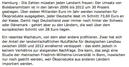 Ein rasantes Wachstum, von dem aber andere profitieren. Zwar hat sich der Anteil der landwirtschaftlichen Nutzfläche für ökologischen Landbau zwischen 2000 und 2012 annähernd verdoppelt - das steht jedoch in keinem Verhältnis zur steigenden Nachfrage. Die kann, das zeigt eine Studie der rheinischen Friedrich-Wilhelms-Universität in Bonn, inzwischen nur noch gestillt werden, weil Ökoprodukte aus anderen Ländern importiert werden.