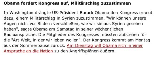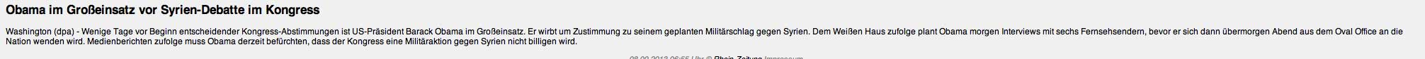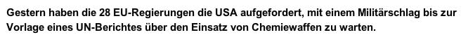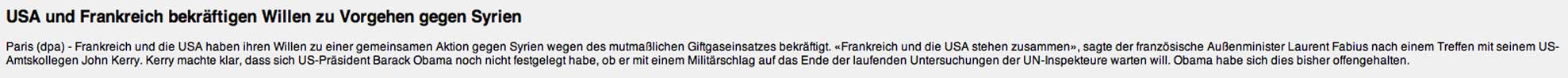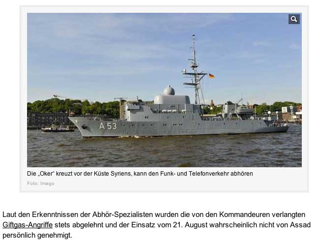 Berlin (dpa) - Syrische Divisions- und Brigadekommandeure haben laut «Bild am Sonntag» seit gut vier Monaten immer wieder den Einsatz von Chemiewaffen beim Präsidentenpalast in Damaskus gefordert. Das würden Funkgespräche belegen, die ein Flottendienstboot abgefangen habe. Das Blatt beruft sich auf Informationen aus deutschen Sicherheitskreisen. Das Spionageschiff der deutschen Marine kreuze vor der Küste Syriens. Diese verlangten Giftgas-Angriffe seien aber stets abgelehnt und der Einsatz vom 21. August wahrscheinlich nicht von Syriens Präsident Baschar al-Assad persönlich genehmigt worden.
