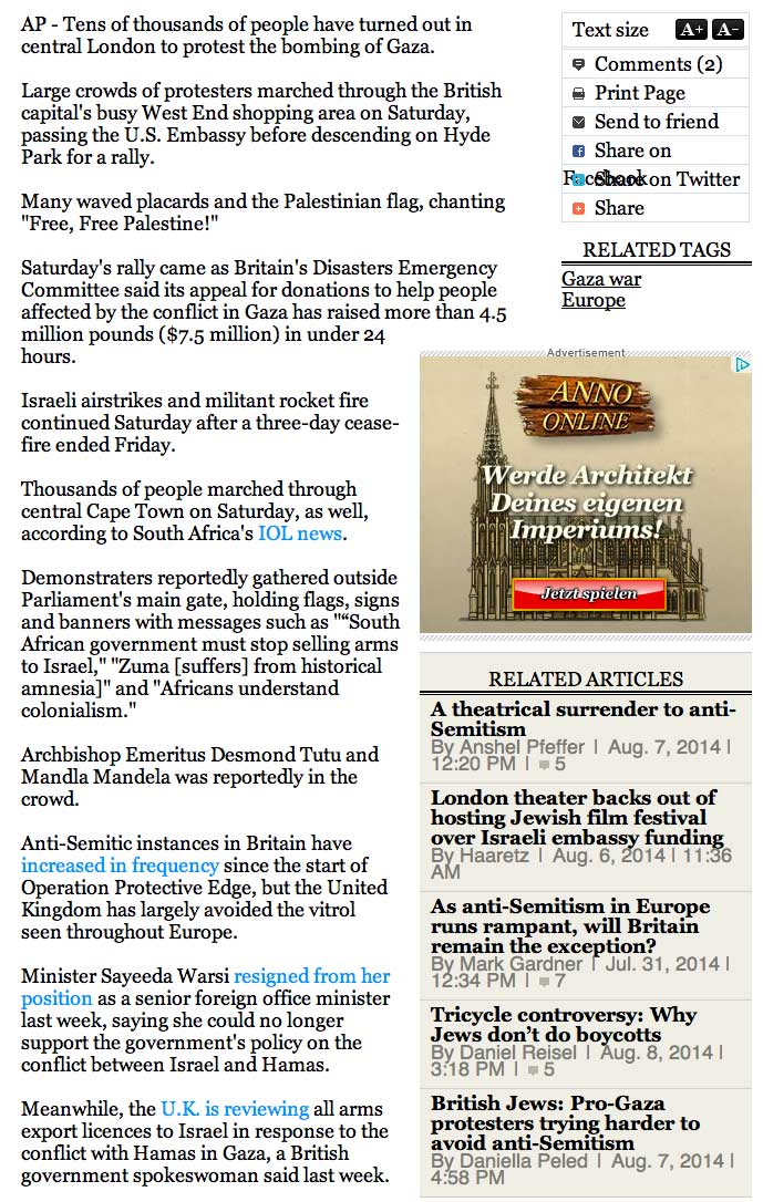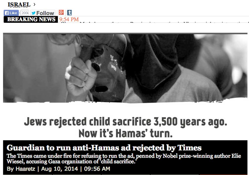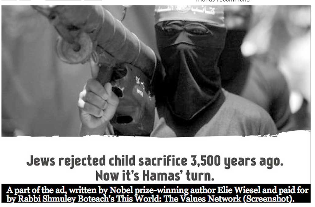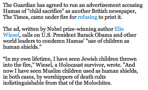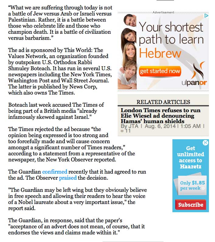 Werbung von Elie Wiesel, Nobelpreisträger, von der NY Times nicht veröffentlicht, vom Guardian als Werbung angenommen, damit man liest.