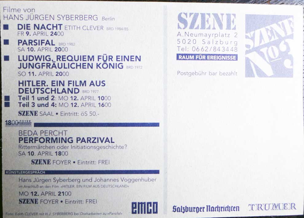 Von dieser Seite Bruch mit den bisherigen Film-Ästhetiken und Produktionsformen (TMS-FilmGmbH). In der NACHT der dazugehörige Text nach Shakesp. Sturm: fort aller bisherigen Zauber und Freunde, Isolatioin von der Welt, Wüste- und Inselsituation. Als Programm. Das Oratorium der Solostimme, Das Soltäre und die messianische Meditation in und aus sich.
