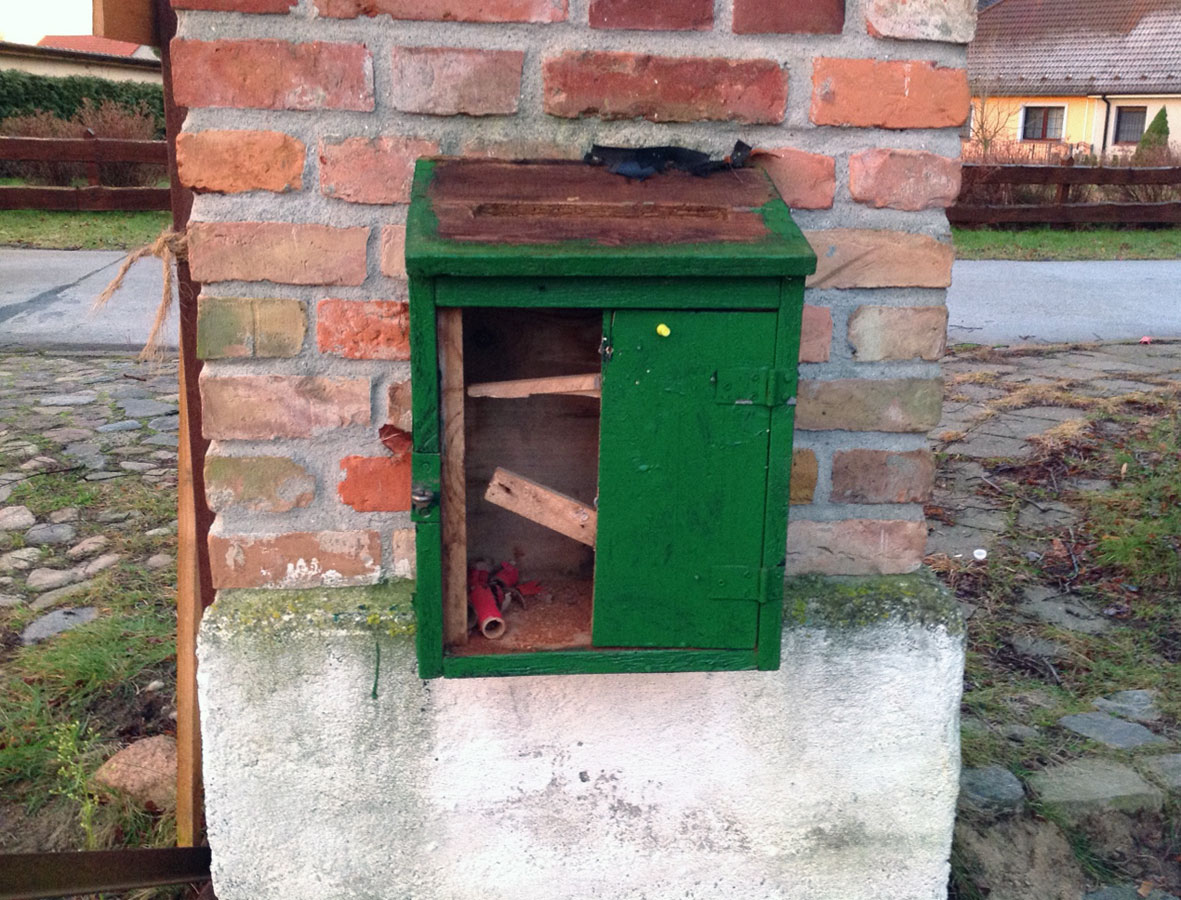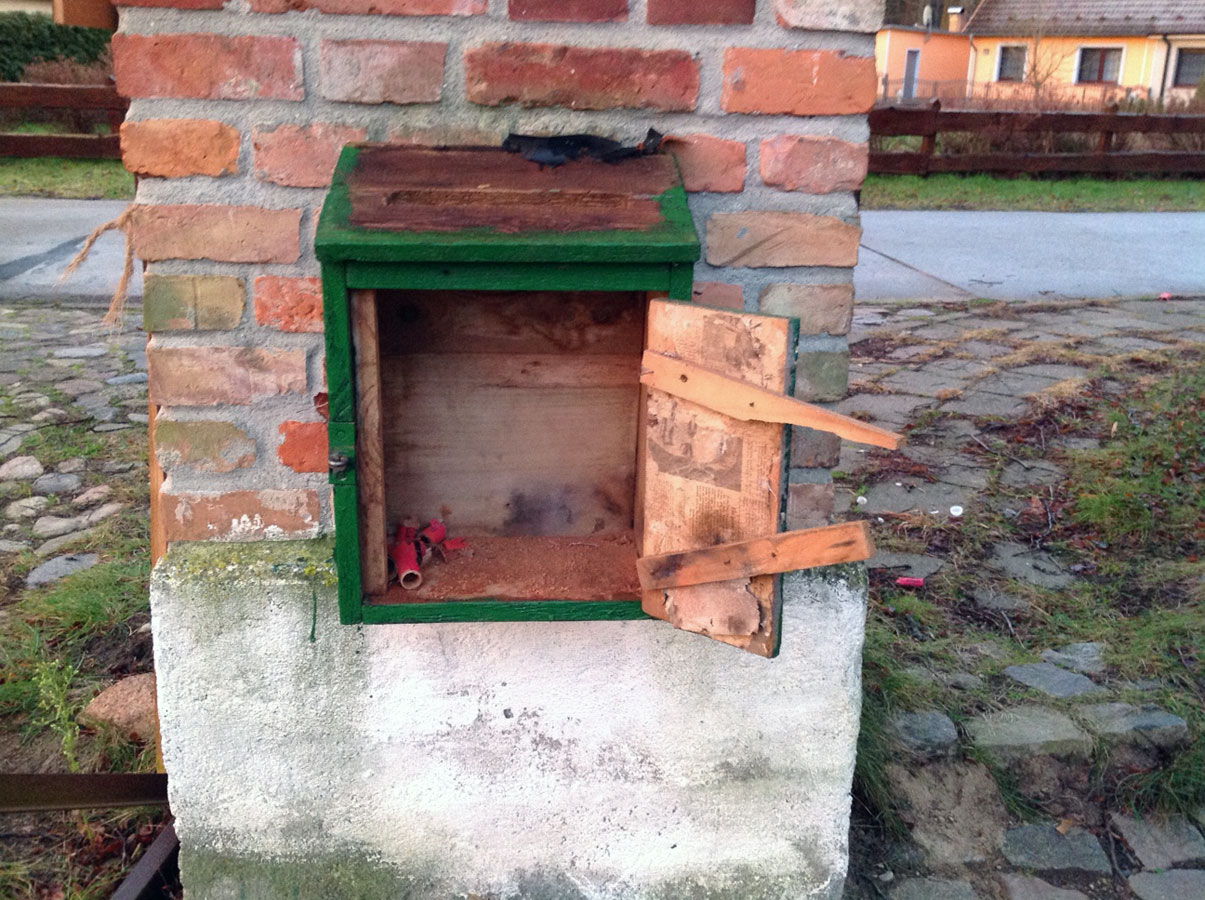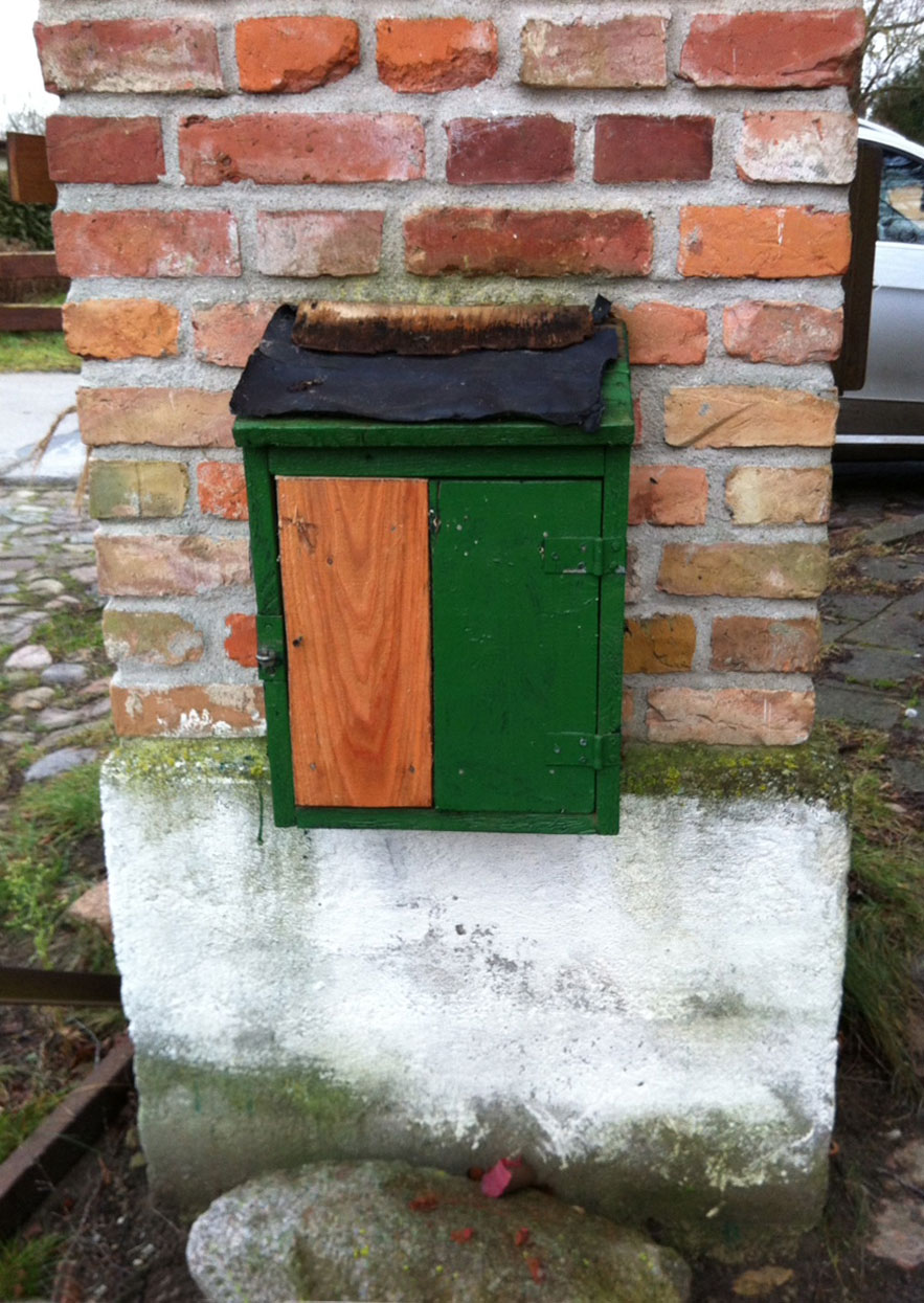 Da das Anwesen unter Denkmalschutz steht, muss dem Verlust des Schildes -als dem letzten des Vaters H.H. Syberberg und als solches hergekommen und von besonderer Bedeutung - nachgegangen werden. Wir schlagen vor und es wäre ratsam die Täter werfen edas Namensschild einfach wieder in den Kasten.