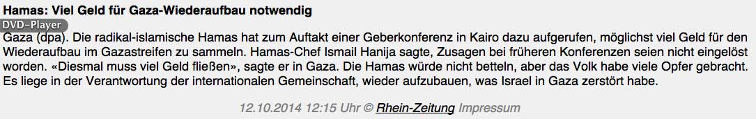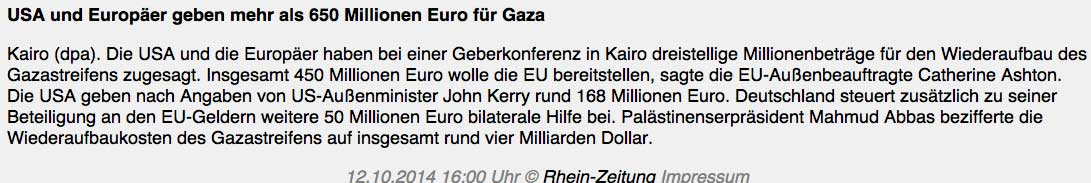 Kairo (dpa). Das Emirat Katar spendet rund 792 Millionen Euro für den Wiederaufbau des Gazastreifens. Die Summe habe Katars Außenminister Chaled al-Attija auf der Konferenz in Kairo bekanntgegeben, berichtete die ägyptische Nachrichtenseite Al-Ahram. Die Europäische Union hatte zuvor verkündet, 450 Millionen Euro bereitzustellen. Die USA geben nach Angaben von US-Außenminister John Kerry rund 168 Millionen Euro. Deutschland steuert neben seiner Beteiligung an den EU-Geldern noch weitere 50 Millionen Euro als bilaterale Hilfe bei.