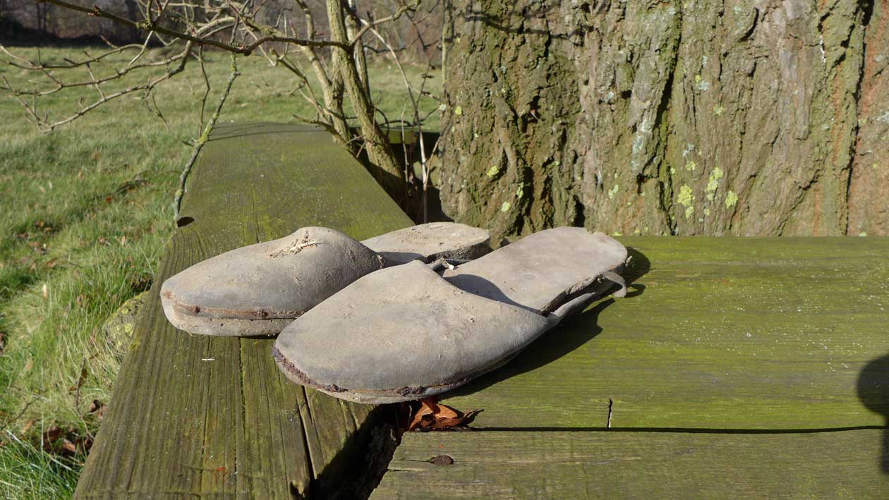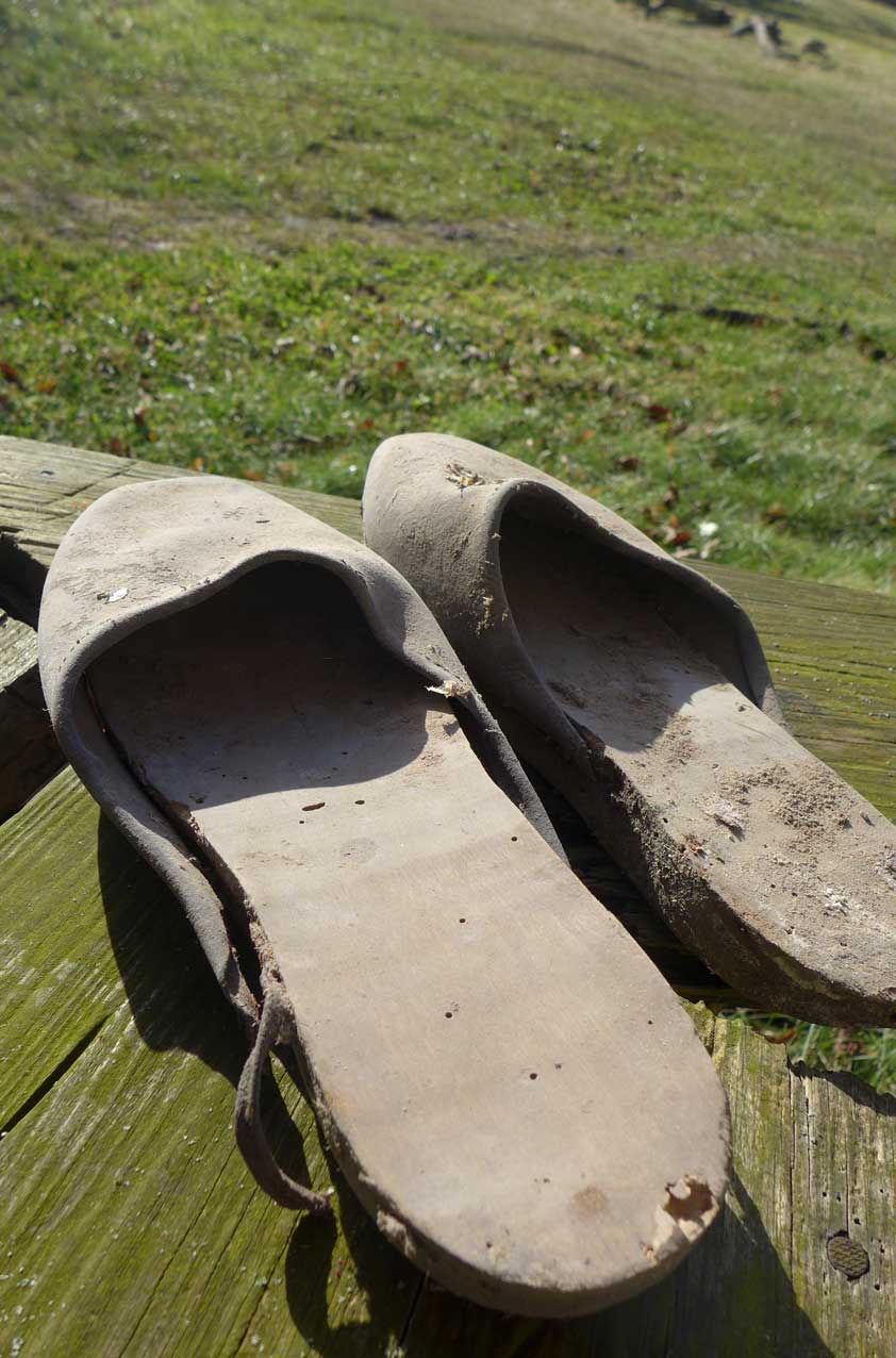 Im Turm geborgene alte Holzpantoffen, zeugen von anderen Arbeiten selbst, zu Gehen und noch in unserer Zeit des Kindes getragen. Fundstücke.