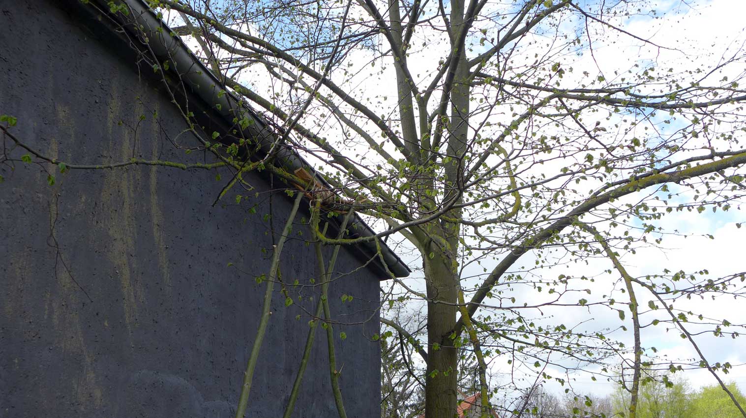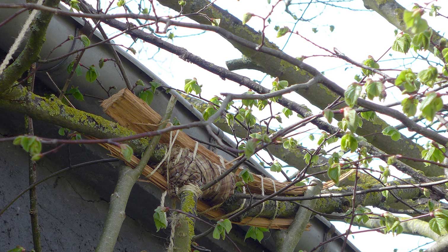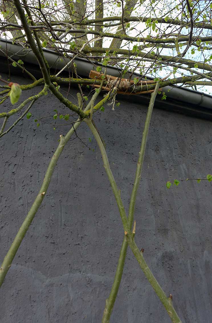 Der Bruch geschah beim Versuch den Ast hoch zu binden. Nun hängst er an der äussersten Rinde und muss im Kern gehalten und gestützt werden werden. Lehm im Verband kühlt und schützt die Wunde. Linden sind rubust.