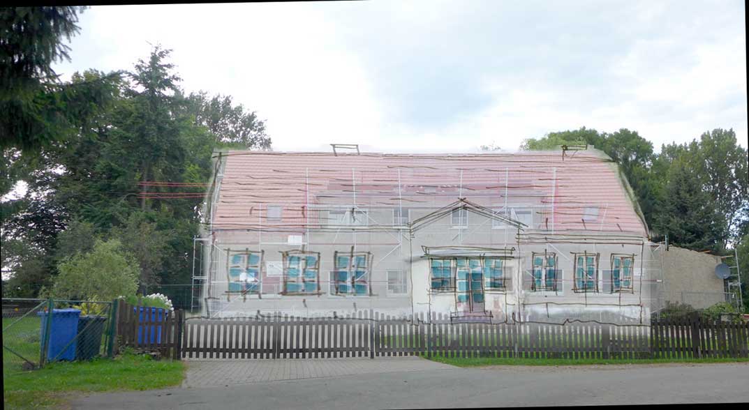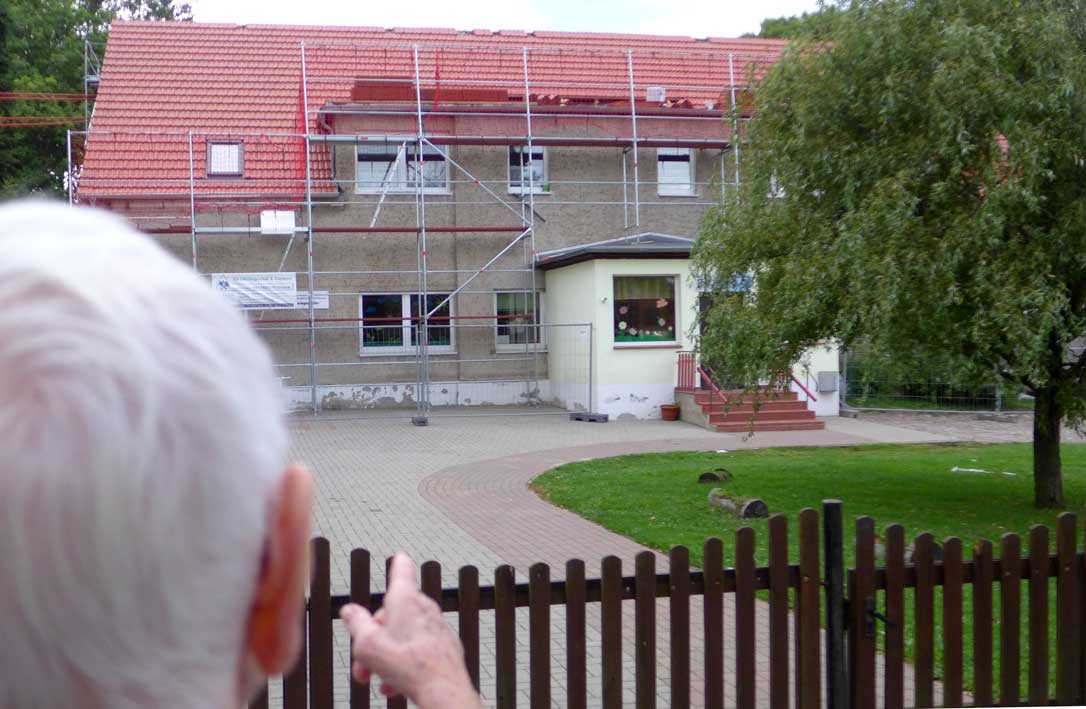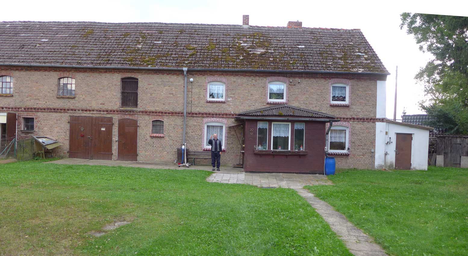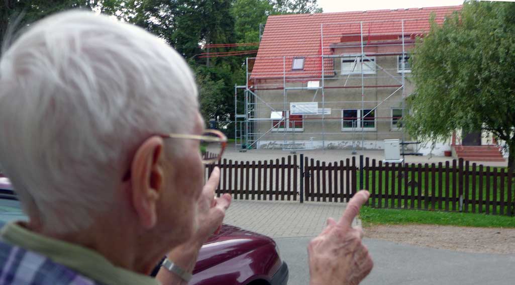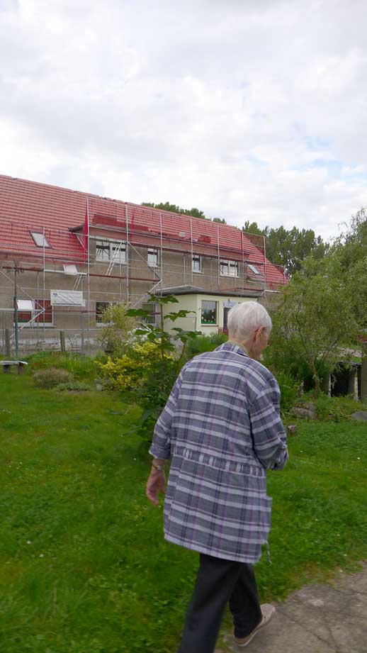 Frau Hamann vor dem ehem. Hamann'schen Gutshaus mit nun neuem Dach ohne Fassade