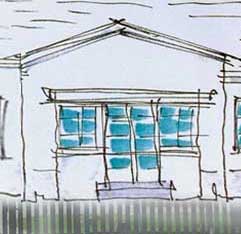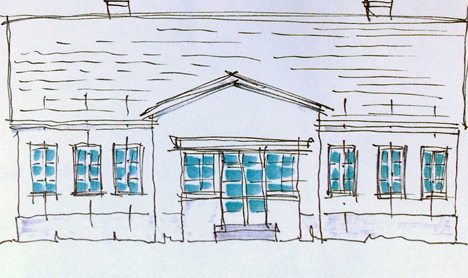 mit wer es noch kannte -nach Zeichnung HJS und Fotos Hamann/Archiv- wird das Haus in Erinnerung haben mit lichter Veranda unter dem Dreiecksgiebel mit 3 Fensterachsen links und rechts unter dem freundlichen Satteldach.